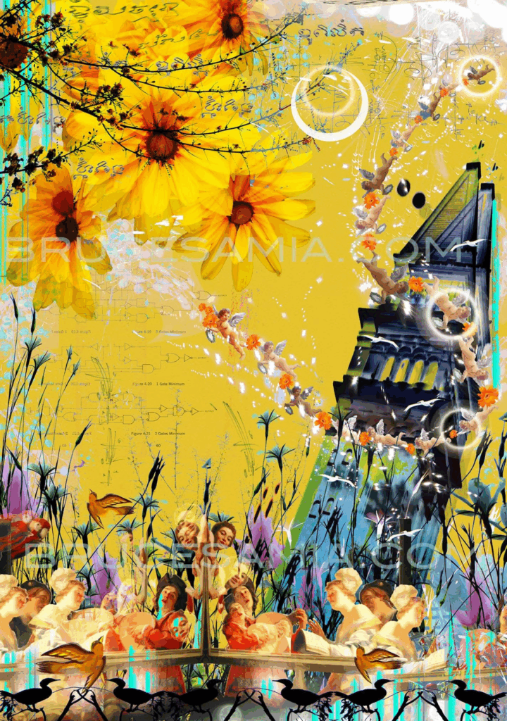 One of the most visually striking elements in Samia’s work is his concept of “depth without perspective.” His digital collages are entirely two-dimensional, yet they often appear to pulse with movement and space.