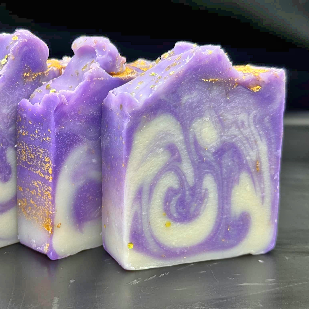 An elegant, high-end fragrance that evokes royal halls, ancient power, and luxury beyond time. Amethyst Aura is a bold, couture-inspired scent—rich, mysterious, and unforgettable. Swirled in shimmering gold, soft white, and deep purple mica, each bar looks like a slice of magic. Crafted with goat milk, beef tallow, coconut oil, and olive oil for a decadent, creamy lather.