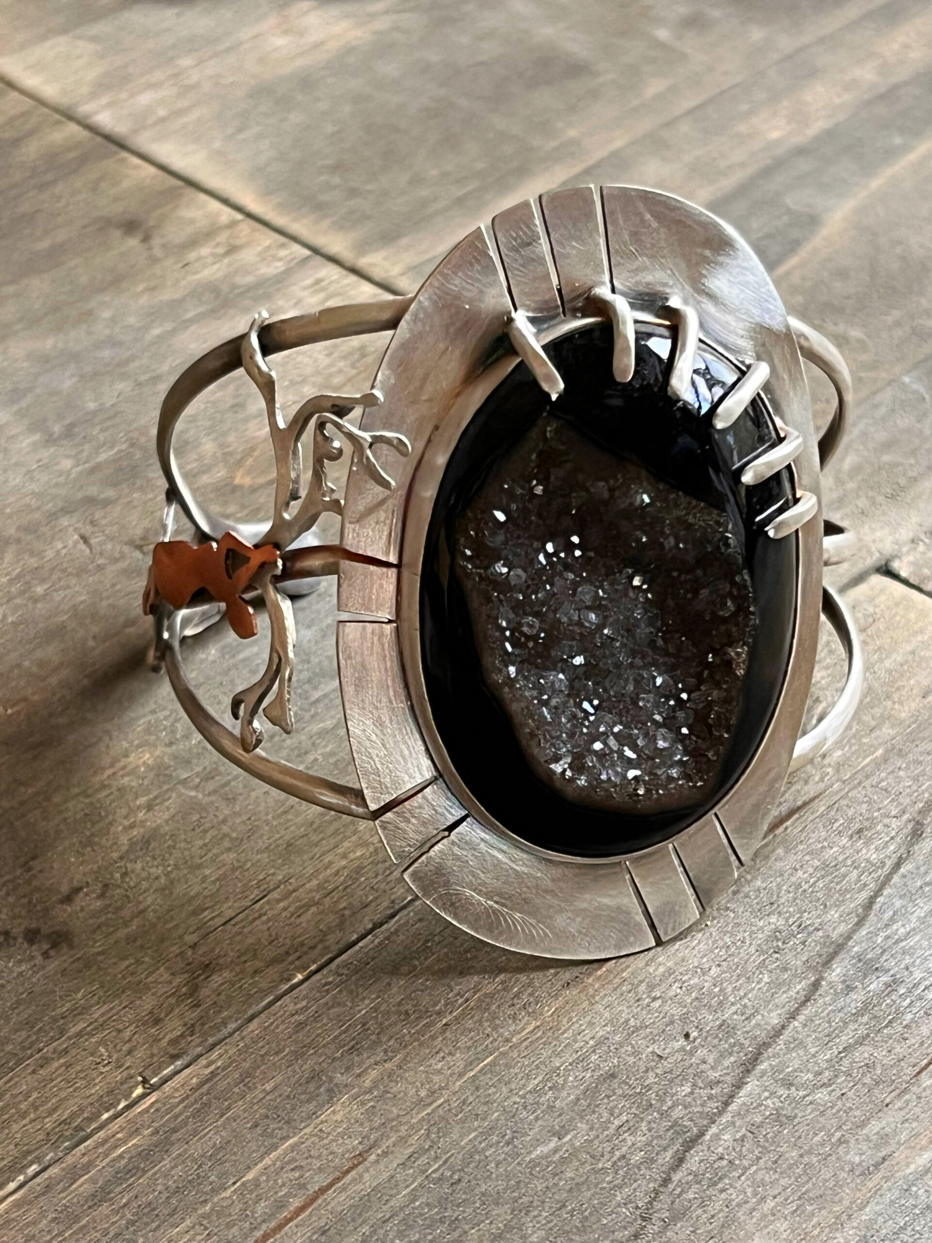 This sterling silver cuff bracelet features a large, captivating onyx drusy that shimmers with natural depth and texture. Along the side of the cuff, a meticulously hand-sawed sterling silver tree stands as a central symbol of ancestry and endurance. From one of its branches hands a copper silhouette of a woman suspended by her wrist-an evocative, emotionally charged image that speaks to struggle, resilience, and the lived history of the African diaspora.