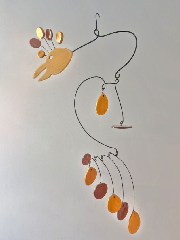 Each hanging mobile is carefully balanced so it can respond naturally to air currents. A subtle shift in temperature, a nearby doorway opening, or the quiet movement of a room is enough to set the forms into slow rotation. The motion is never mechanical or forced. It’s organic, gentle, and continuous.