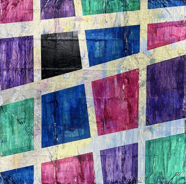 This abstract art piece, created by South Florida based Multimedia Artist Gary Gore, is part of the BABEL series, particularly inspired by his intrinsic connection to New York City. Using a 1960’s AAA roadmap as a starting point, he traces his roots along the northeastern part of his life.