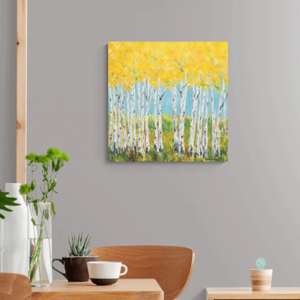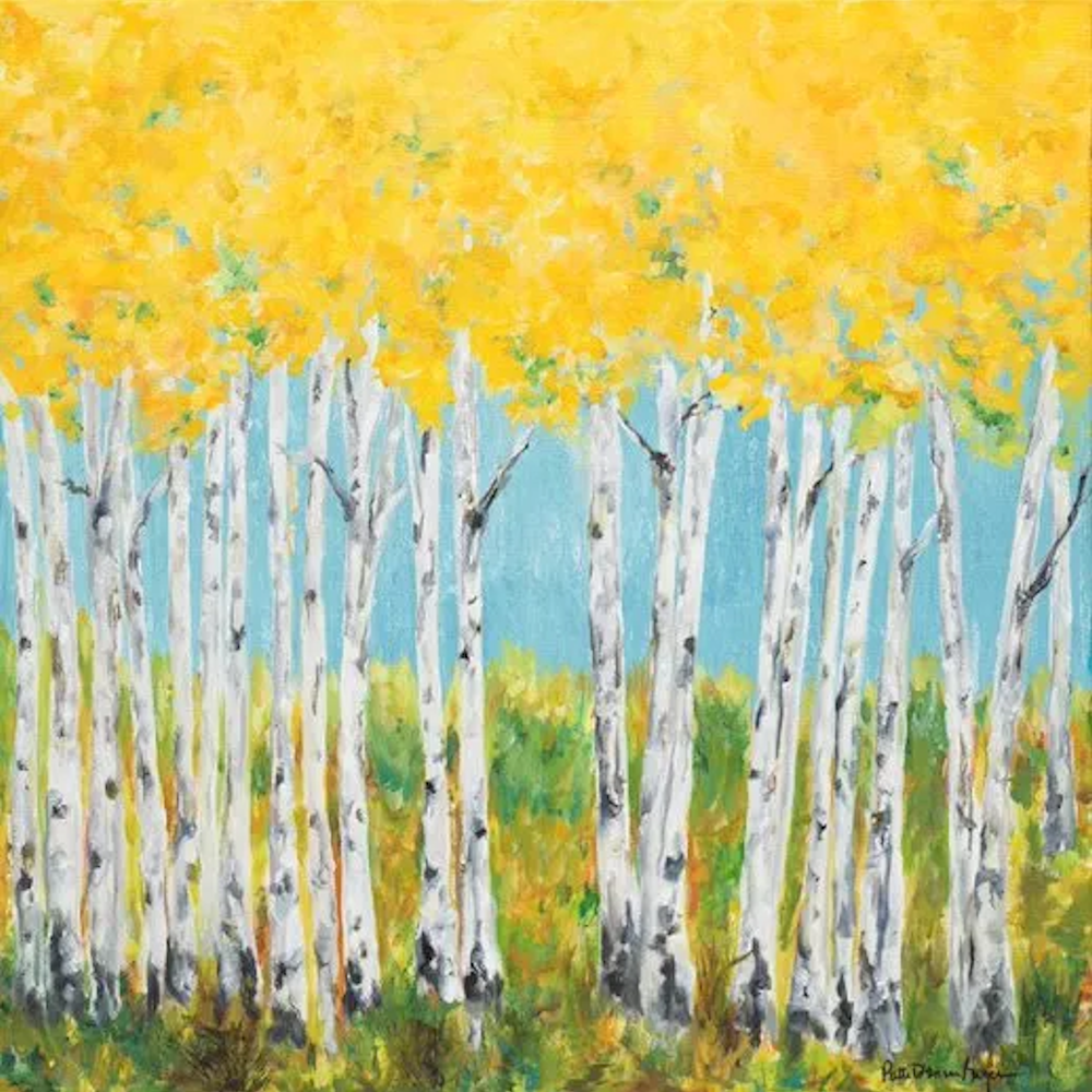 Gold leaves. White bark. Quiet strength. A forest at rest, glowing in autumn light. This stunning piece captures the natural order and quiet majesty of the season. This limited edition giclée is a true-to-original replica of Patti D’Eri’s painting—printed on canvas, hand-stretched, and gallery-wrapped, ready to hang without framing.