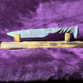 Hand-forged from a reclaimed railroad spike, this Bowie knife pairs a classic blade profile with a naturally curved handle for balance and comfort in hand. Forged entirely by hand using traditional blacksmithing techniques, each blade is fire-forged and finished by the artist in her Seattle forge, resulting in a one-of-a-kind piece marked by subtle variation and expressive form.