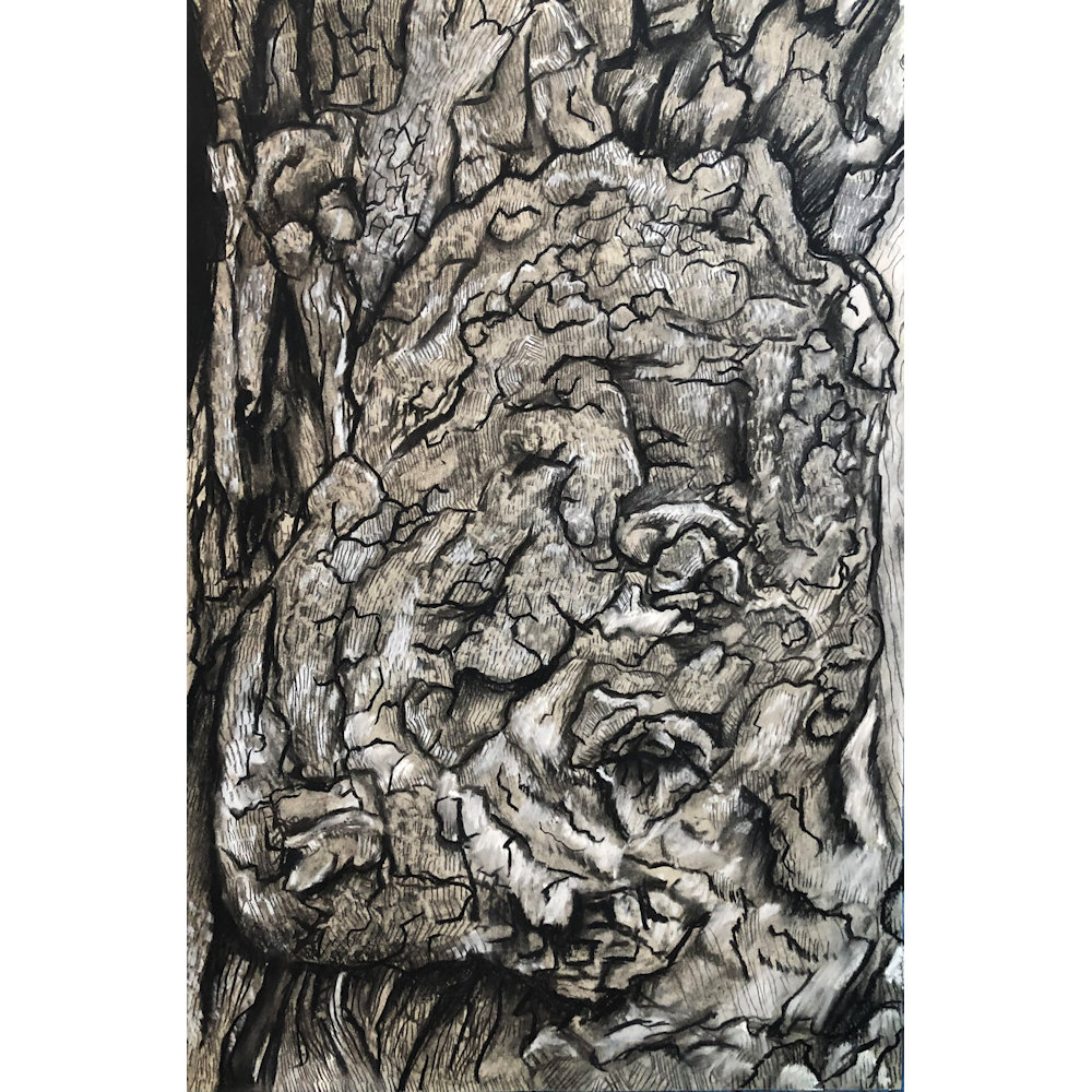 Expressive line work brings this image to life, revealing the dense knots, cracks, and swirling grain of a tree burl that subtly exposes a face emerging from the wood. Layers of crosshatching and ink washes create depth and movement, encouraging the viewer to uncover new details within the richly textured surface.