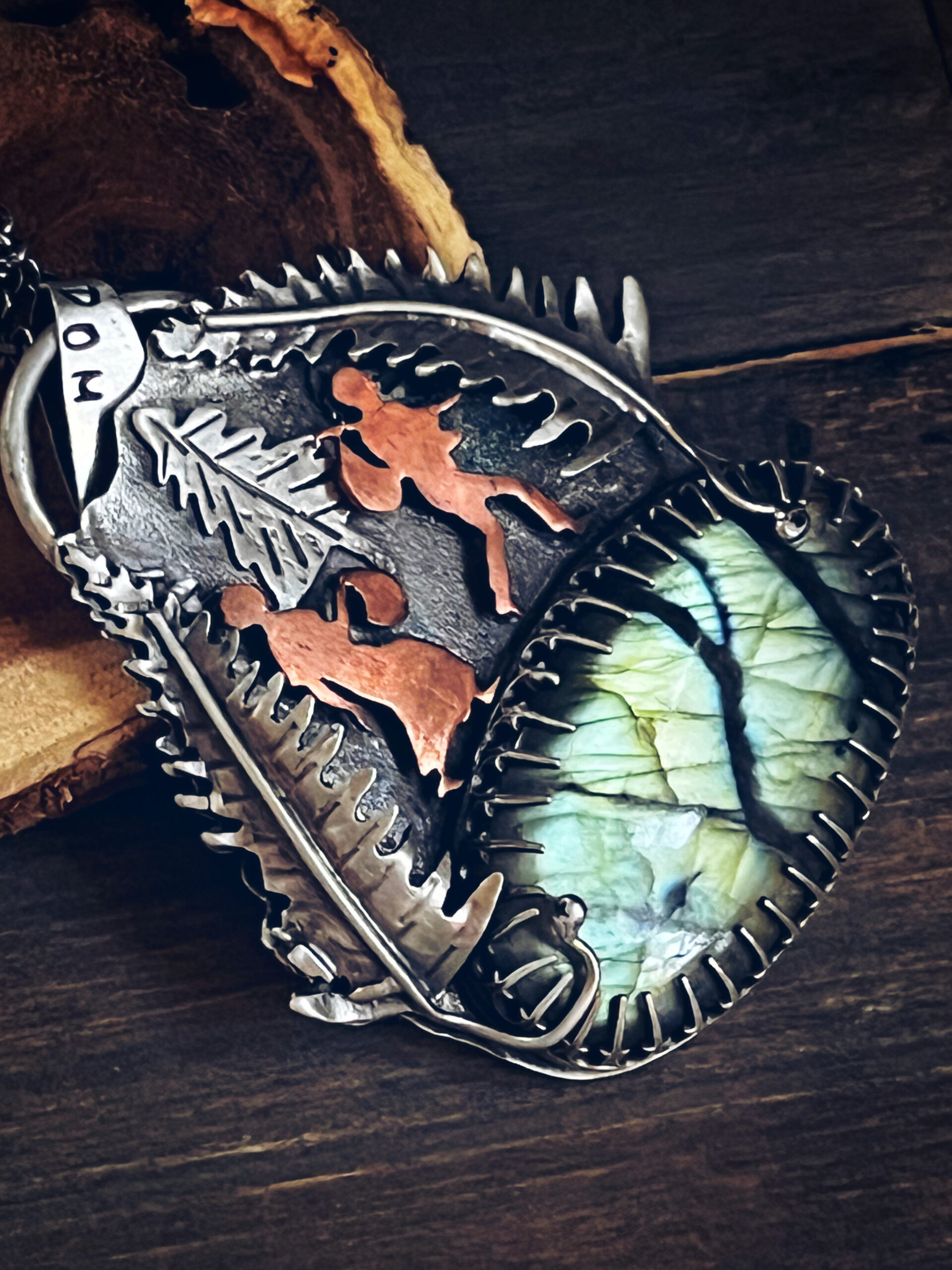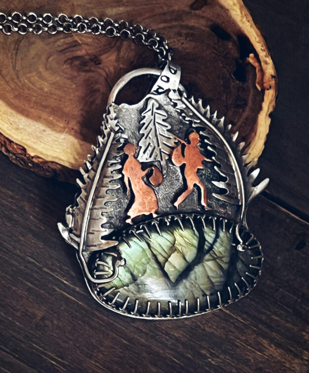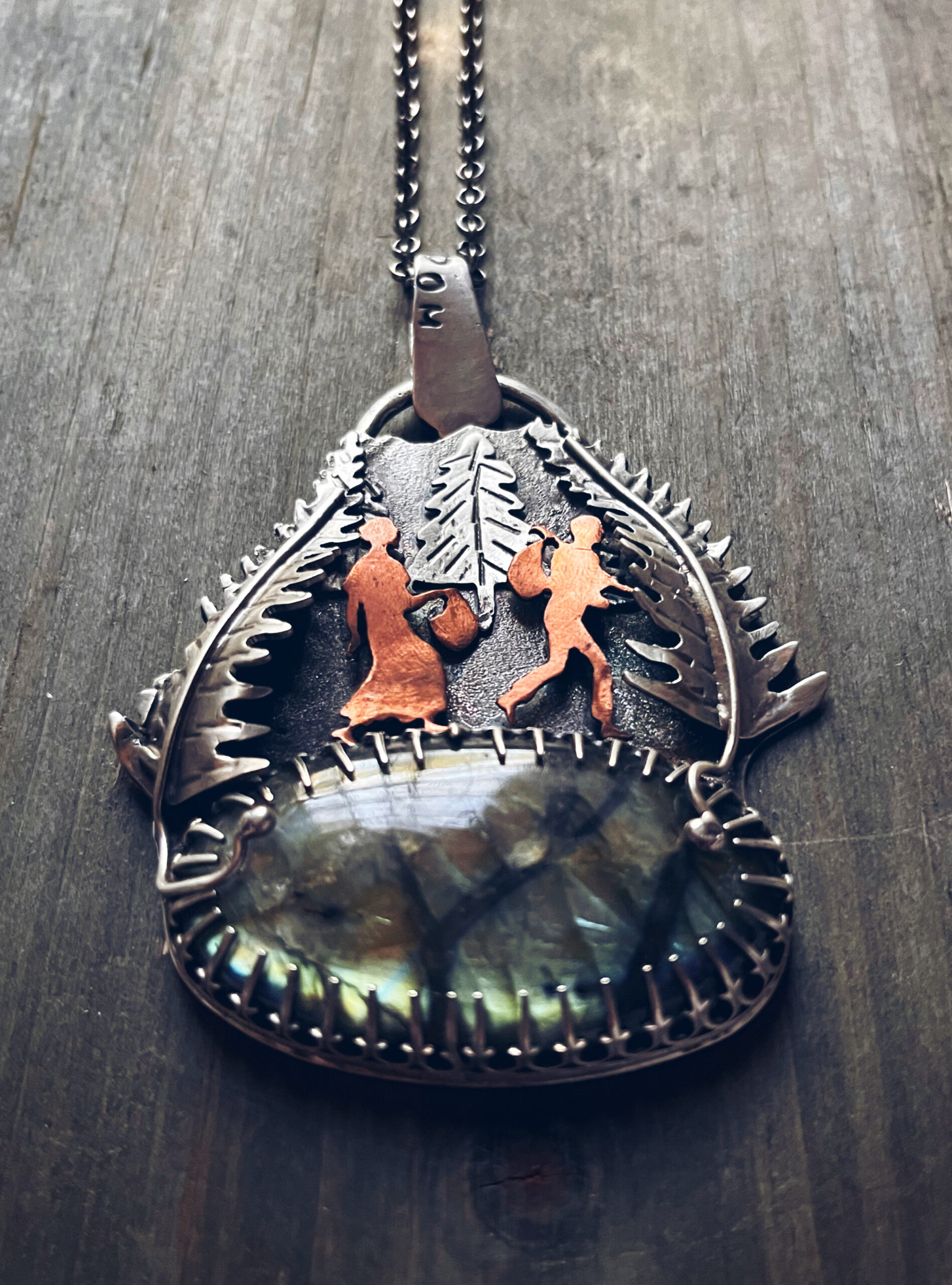 At the base of the pendant rest a beautiful iridescent labradorite stone. Its shifting blues and greens evoke the early light of dawn-the movement when escape was safest and hope felt within reach. The stone appears nestled within the wooded scene, illuminating the path of the courageous souls pressing forward.
