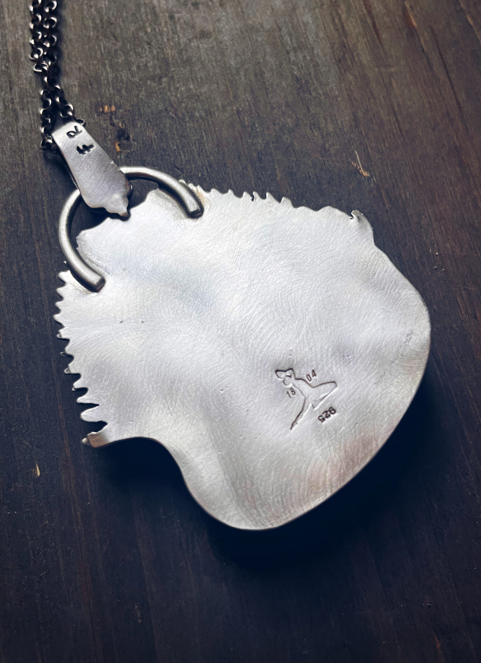 On both sides of the pendant, hand-sawed ferns emerge from the silver. These ferns represent resilience, endurance, and the quiet protection nature offered to those escaping in secrecy. The textured silver background resembles a forest, creating the sense of movement through trees and shadows.