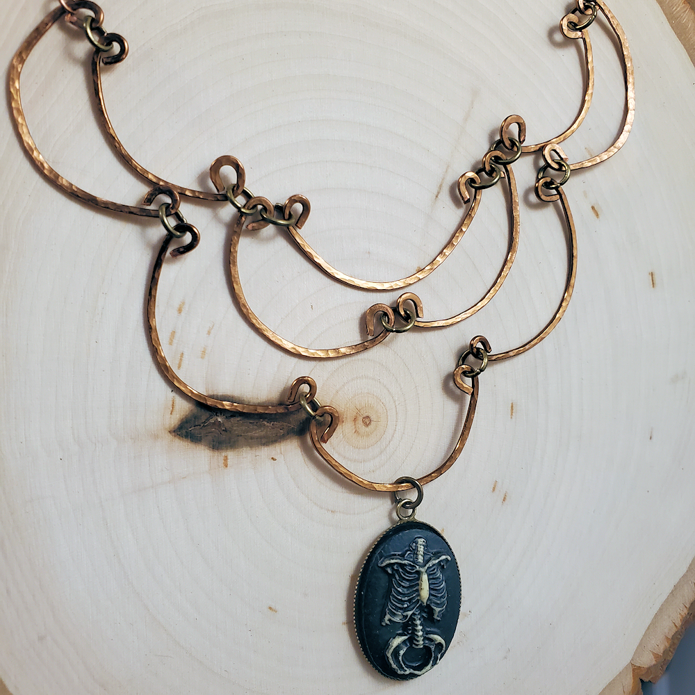 Immerse yourself in the dark elegance with Dragon Tree Jewelry’s Gothic Layered Copper Necklace. This showpiece gothic necklace features hammered copper wire and a skeletal pendant, perfectly blending artisanal craftsmanship and gothic allure. Each layer captures a touch of mystery, making it an ideal addition to your unique collection. Handcrafted with meticulous attention to detail, this piece echoes our commitment to crafting elegance from our home to yours. Elevate your style and make a statement with this striking, one-of-a-kind necklace.
