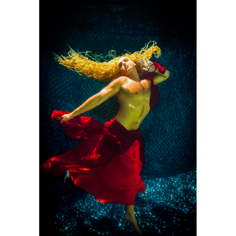 Bathed in golden light and drifting beneath a sea of silence, Dream Master captures a man caught in the quiet space between dreaming and waking—where time blurs. His long hair sways like ocean threads, listening to whispers only the ocean knows. Wrapped in flowing red, he becomes both sentinel and siren—a vessel for the sensual pulse of the deep. The light touches him like a secret, casting him in a reverie of warmth and wonder. Photographed by MeduSirena—celebrated aquatic performer and performance icon—this portrait channels the luxurious depth and emotional intimacy that defines her body of work.