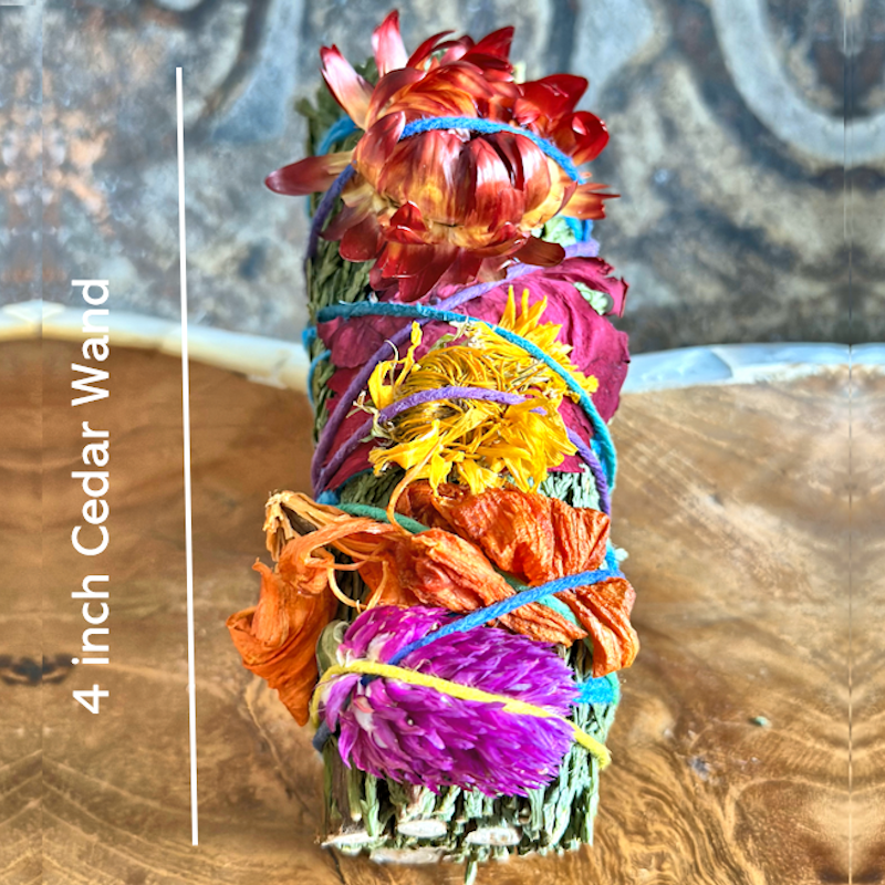 Ground your spirit, clear your space, and connect to sacred Earth wisdom with this handcrafted cedar smudge wand. Lovingly hand-tied with rainbow hemp twine and adorned with organic, peak-picked flowers, each 4-inch bundle is made one at a time with deep care and intention. Cedar’s grounding, purifying smoke offers powerful support for protecting your energy, releasing emotional clutter, cleansing your home or altar, honoring ancestors, and inviting fresh starts with spiritual clarity.