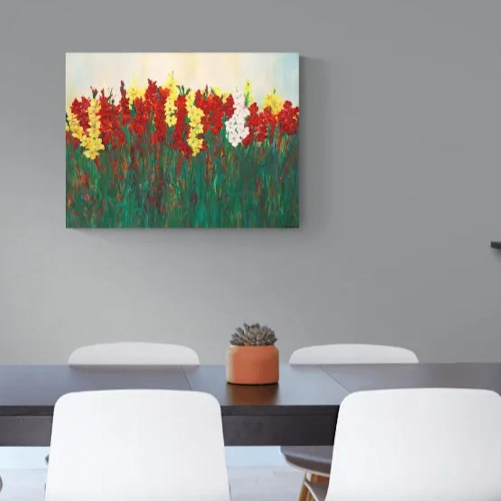 Bold reds. Radiant yellows. Lush greens. This spirited painting captures the vibrant energy of early summer—tall blooms reaching skyward in a burst of color and life. A celebration of strength and beauty in full bloom. The limited edition giclée is a faithful reproduction of Patti D’Eri’s original painting, printed on canvas and gallery-wrapped by hand.