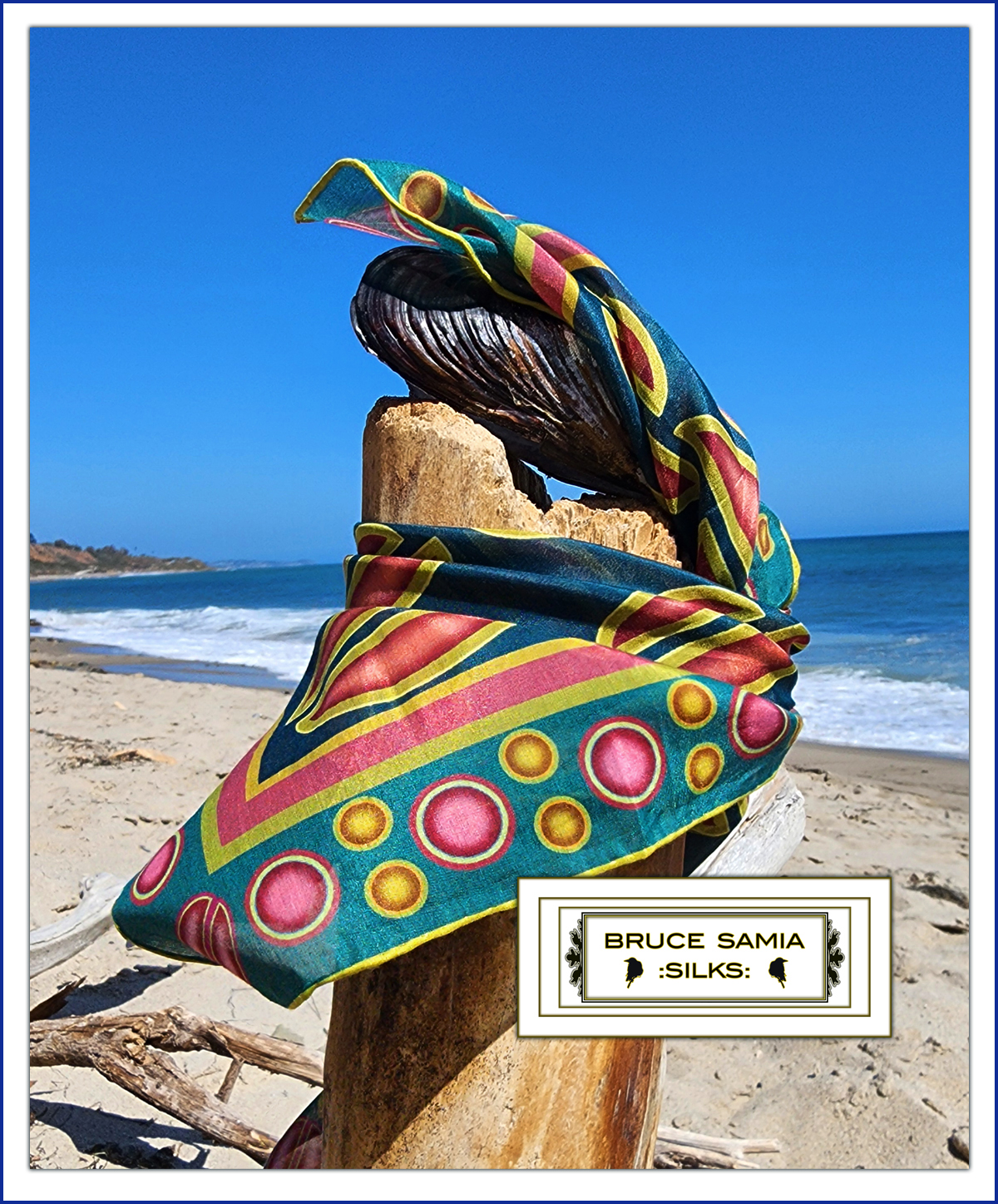 Deep tones of Rich Blue-Green with a Bright Coral accent and a Gold hem. A fun, lively addition to any wardrobe.