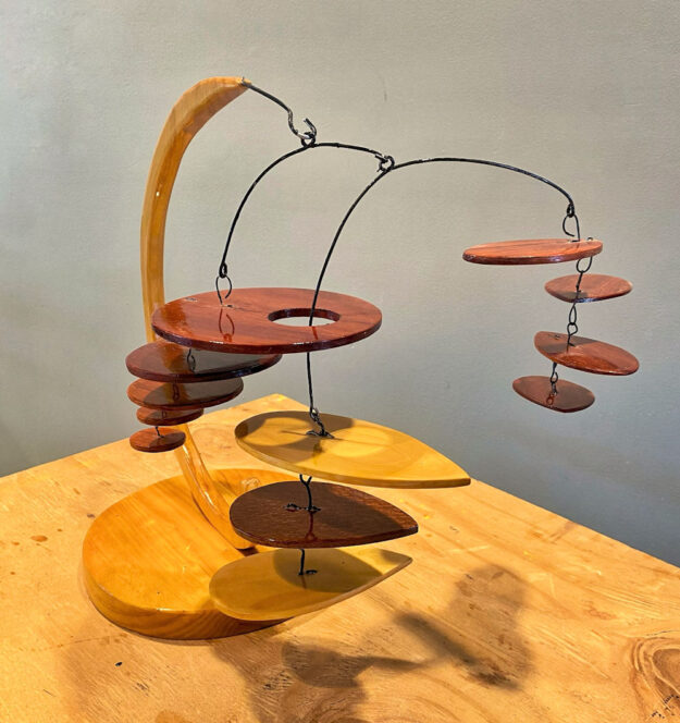 Layered woods create visual rhythm in this horizontally balanced piece. Finished with spar varnish for protection and richness, and mounted on a circular pine base.