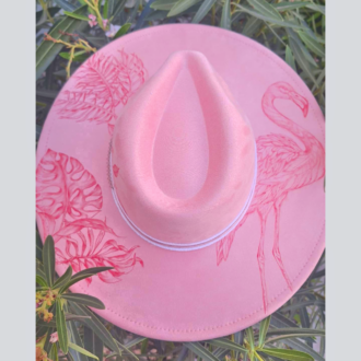 A natural suede fedora embellished with stitched leather hatband and feather, features elegant horses framed by the desert landscape. This hand-burned design captures the quiet power and grace of wild horses under a sun-soaked sky. Find designs under the brim too! One size fits most – includes adjustable inner band for a snug, secure fit.