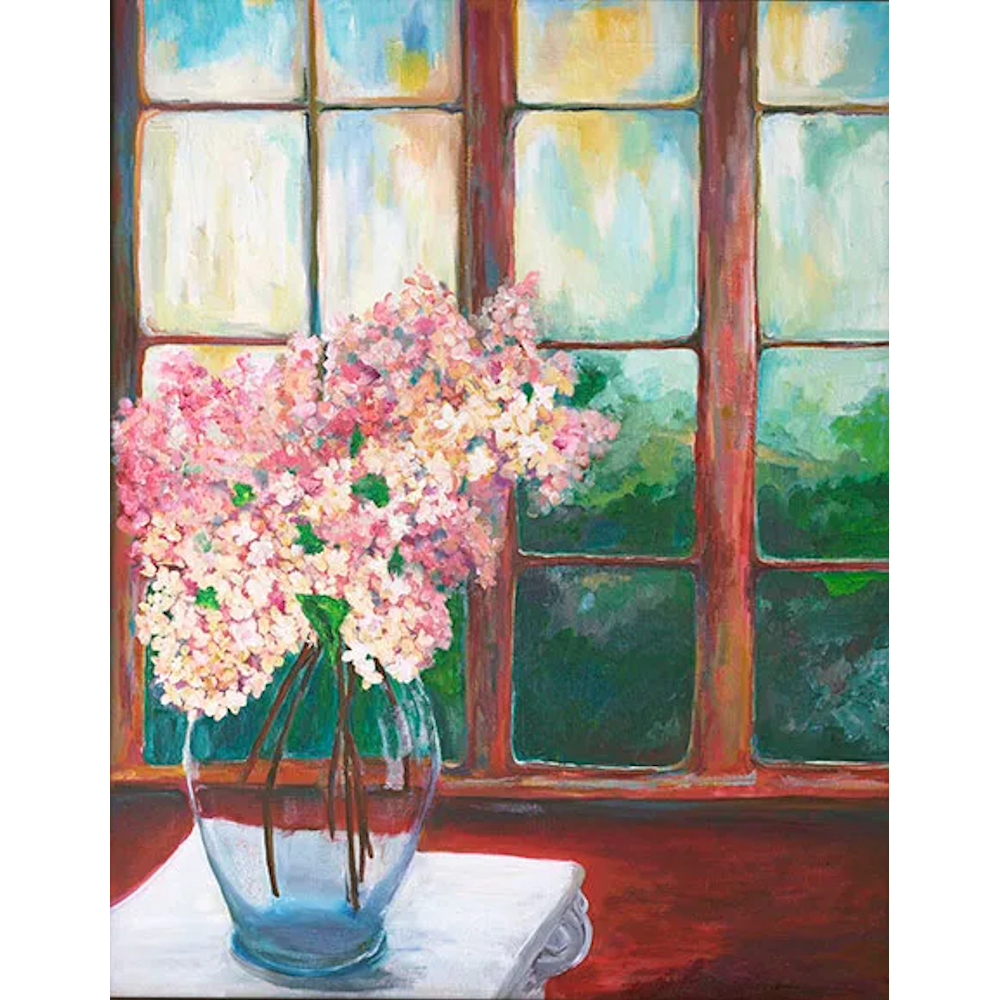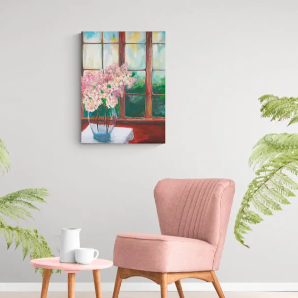 Step into the serene beauty of spring with this calming original oil painting that captures the quiet magic of a moment viewed through a sunlit window. This 20″ x 24″ piece invites you into a tranquil scene where soft light dances across delicate hydrangea blooms, evoking the comfort of a fresh spring morning. Framed in elegant brown wood, this one-of-a-kind painting carries the warmth and stillness of a space between thought and creation.