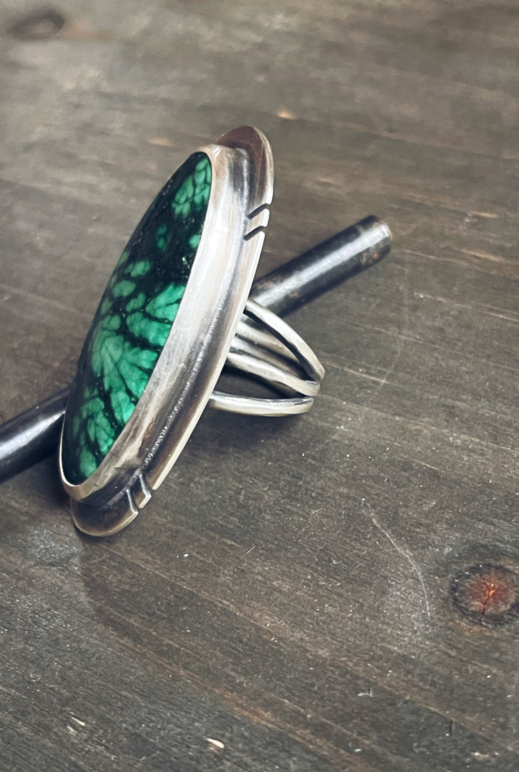 A beautiful oblong sterling silver malachite ring featuring a vibrant green stone with natural, highlighted swirls. The border of the ring frames the stone with hand-cut slits, and the silver is finished with a soft, shadowy brushed finish that gives this piece depth and an organic, elegant feel.