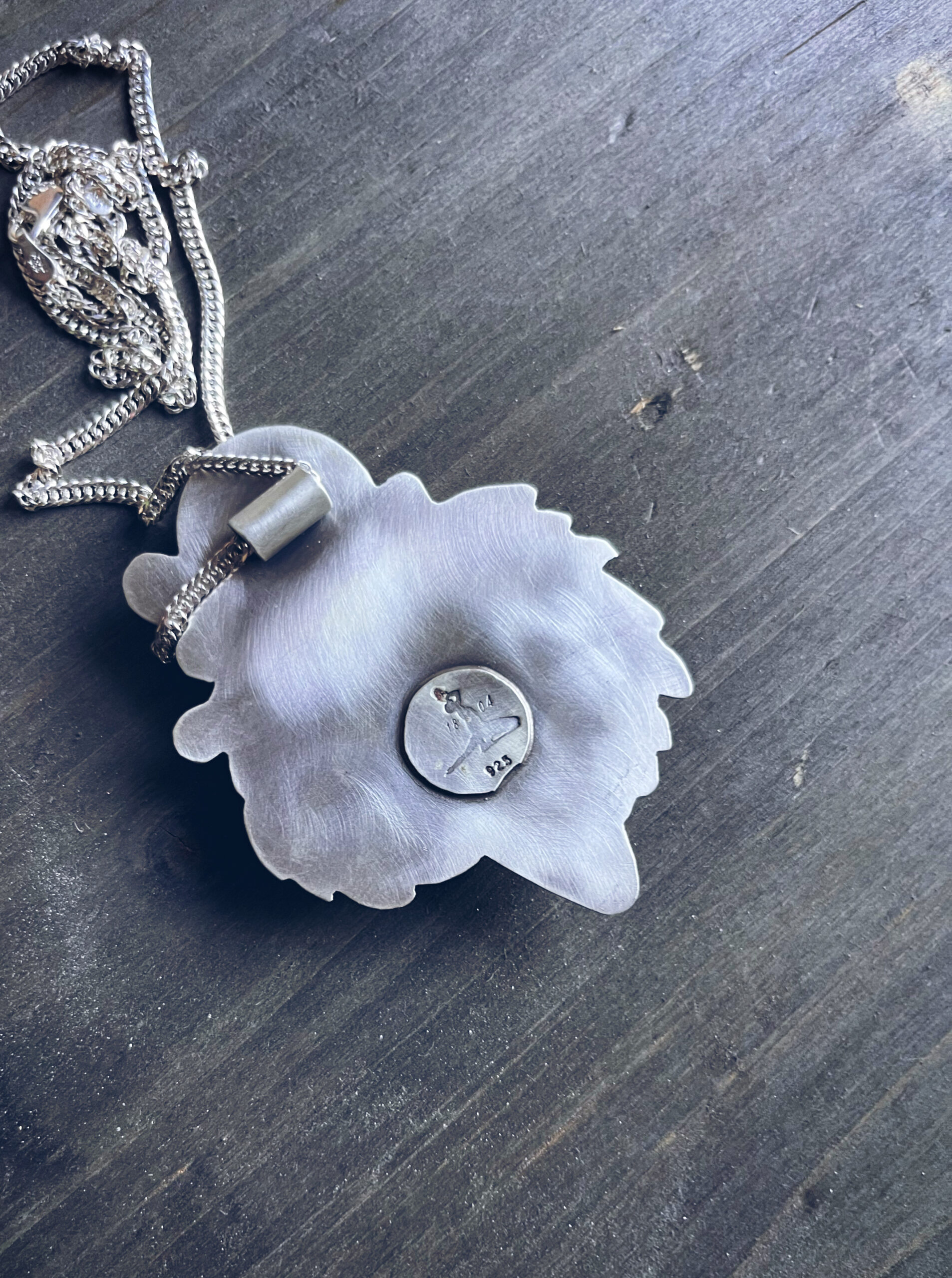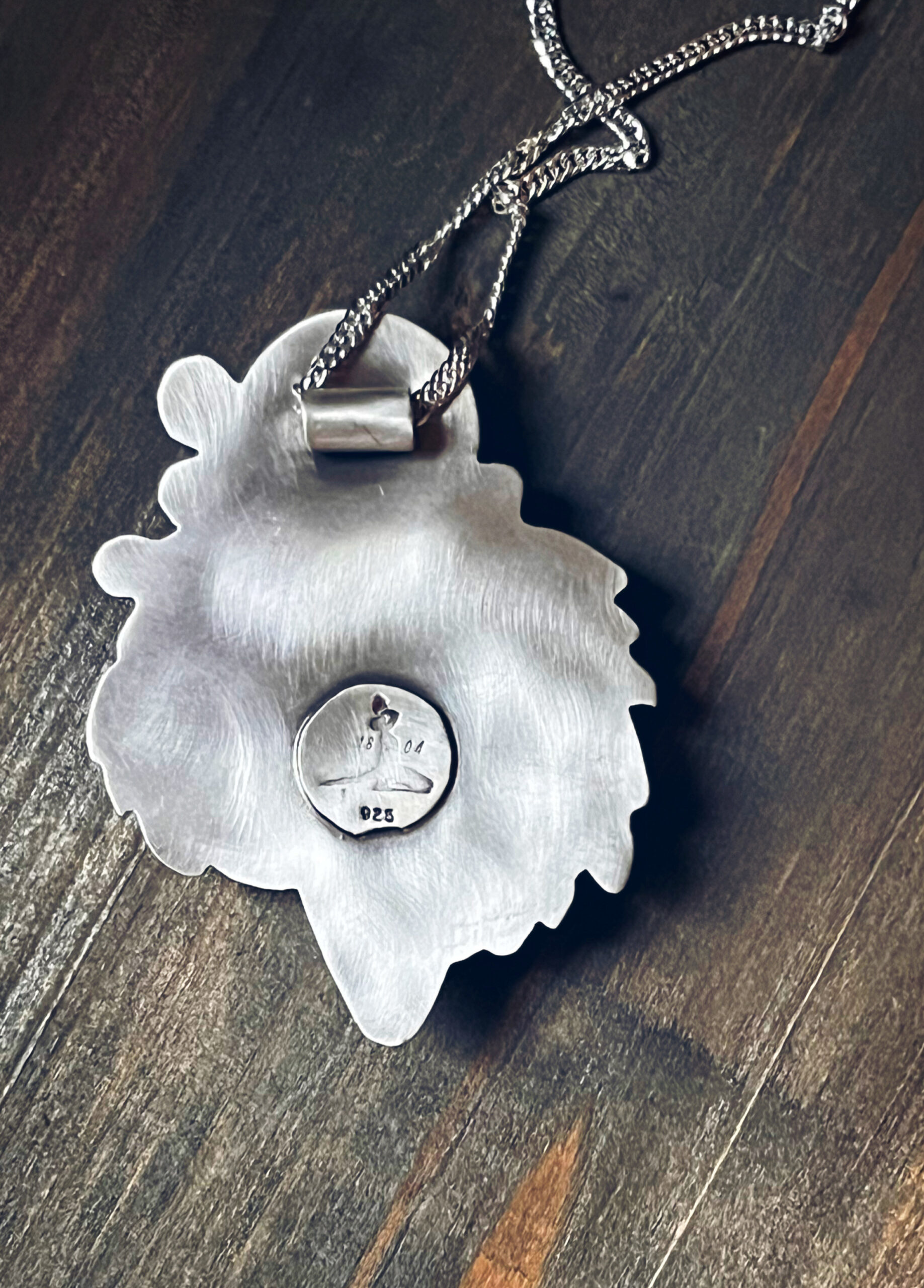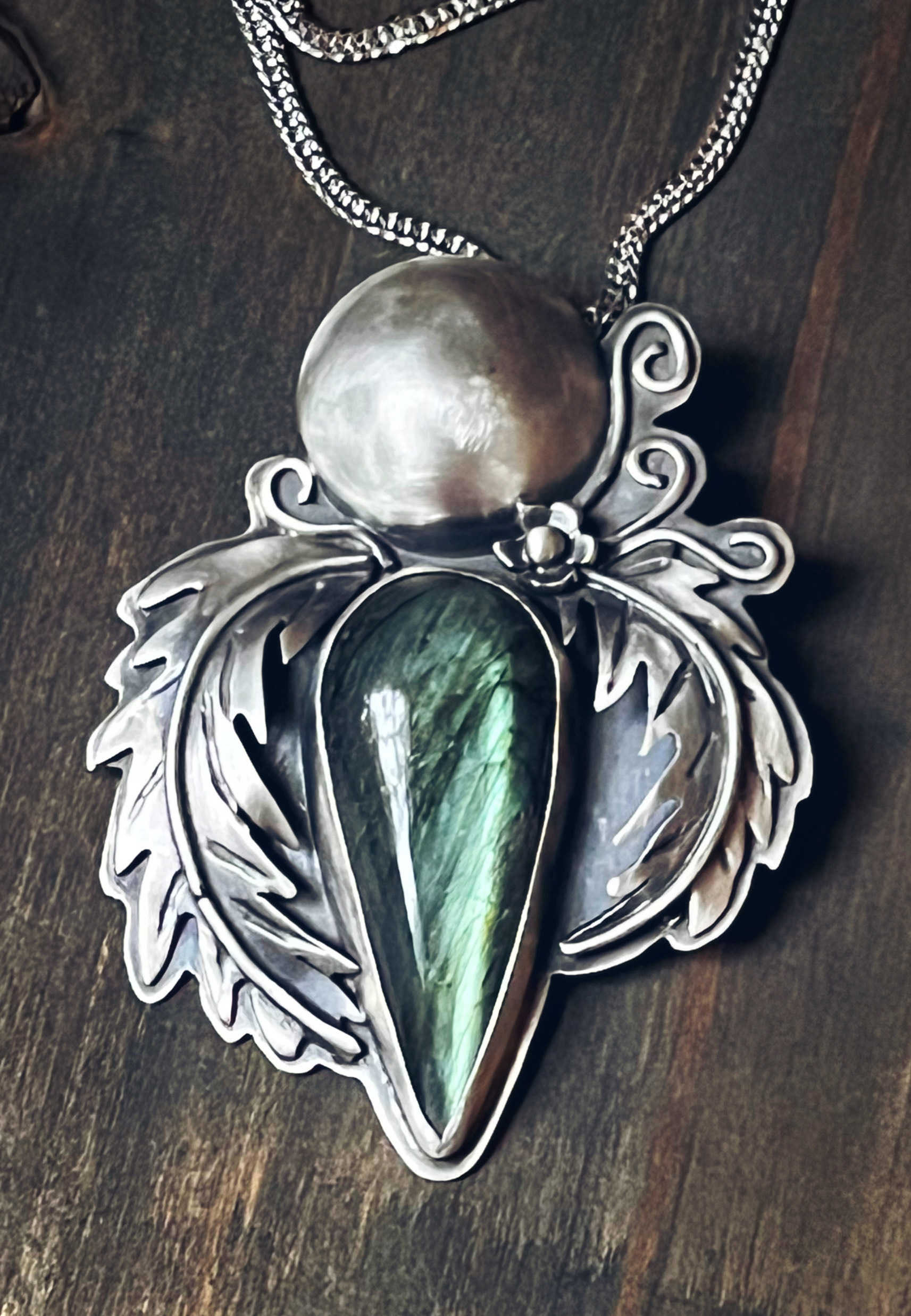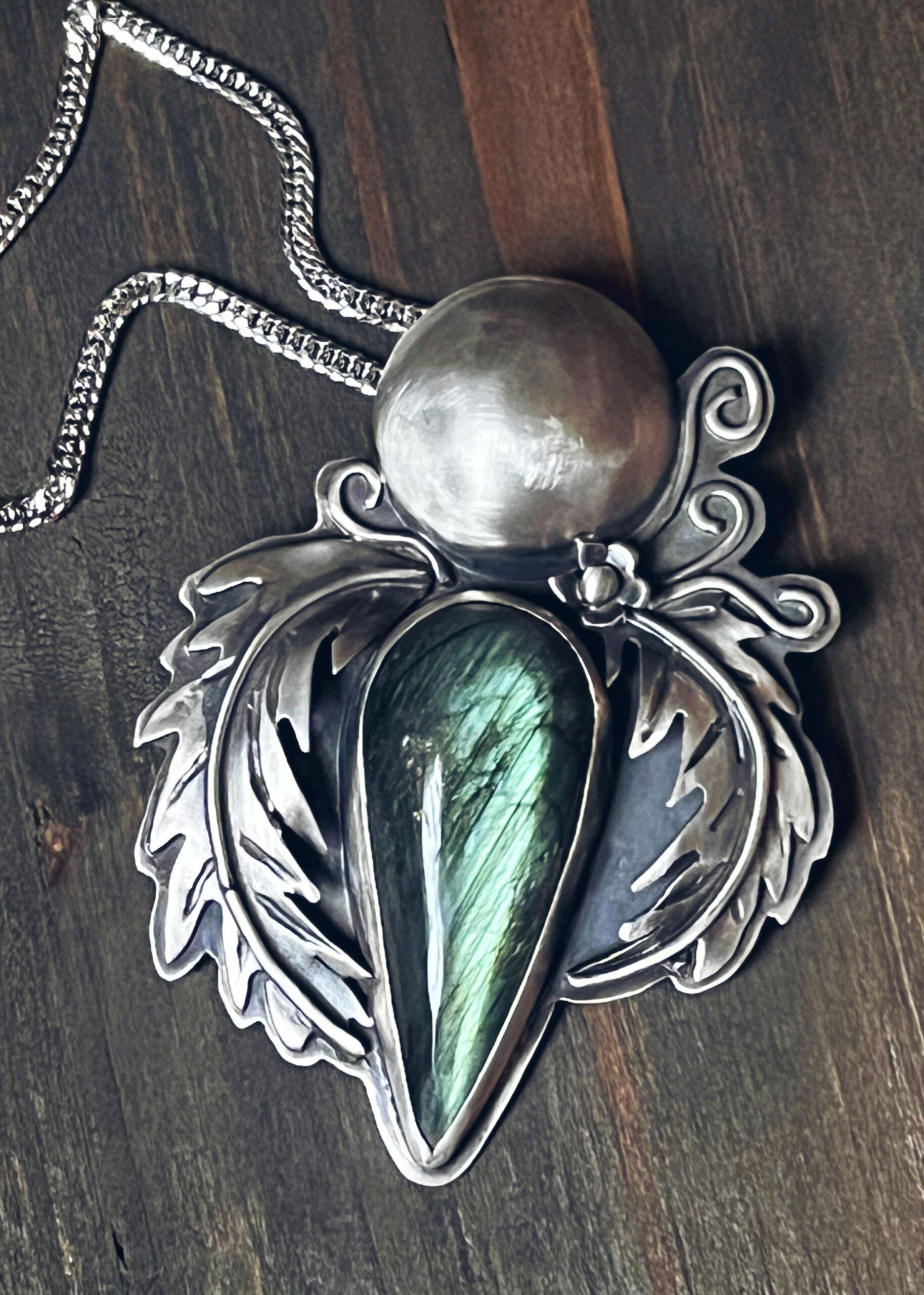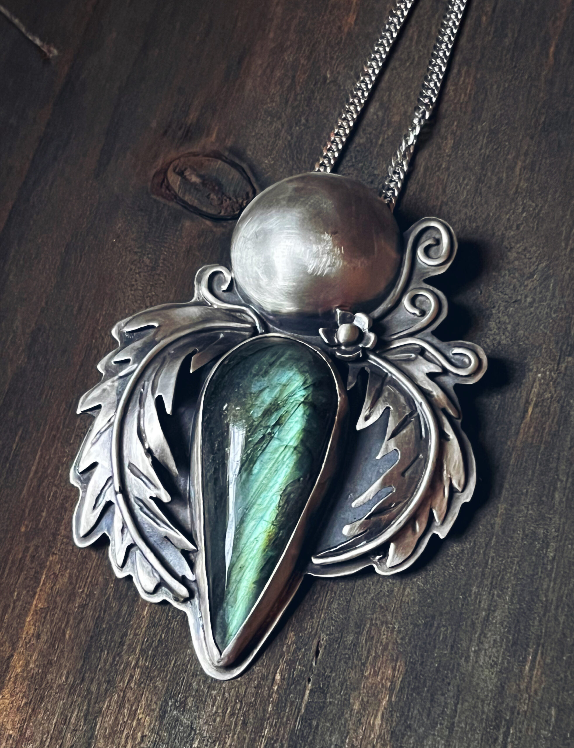 This Mama Earth pendant is a deeply feminine, earth-centered piece sculpted in sterling silver. At its heart lies a glowing labradorite, shifting with flashes of blue, green, and gold-a stone long associated with intuition, magic, and inner light. Its shimmer brings the pendant to life, like a quiet spirit moving beneath the surface.