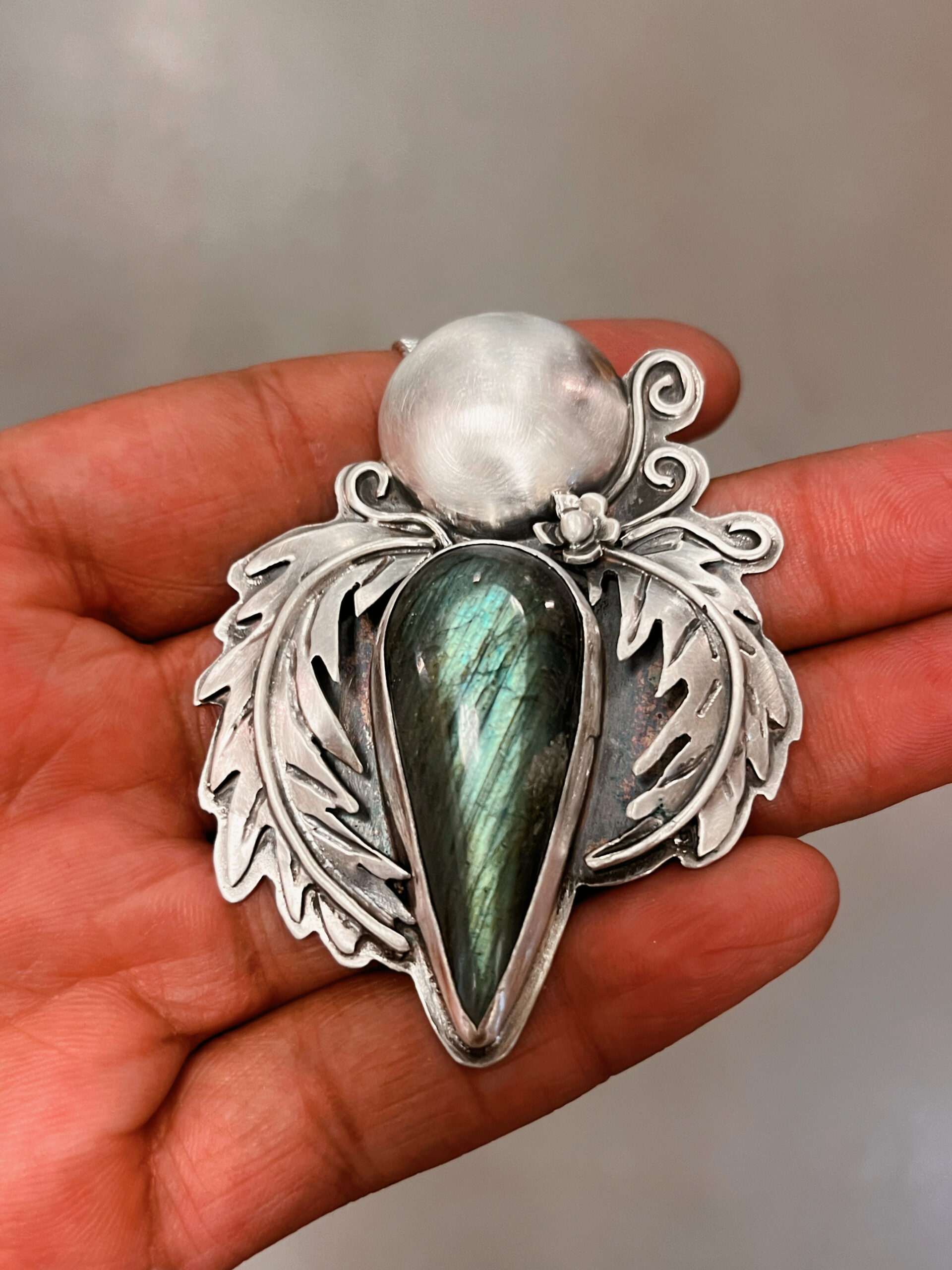 Surrounding the central stone are hand-sawed ferns a tiny pure flower, taken from the artist original drawings. These delicate botanical elements frame the labradorite like a living crown, weaving together nature, ancestry, and the sacred beauty of womanhood.