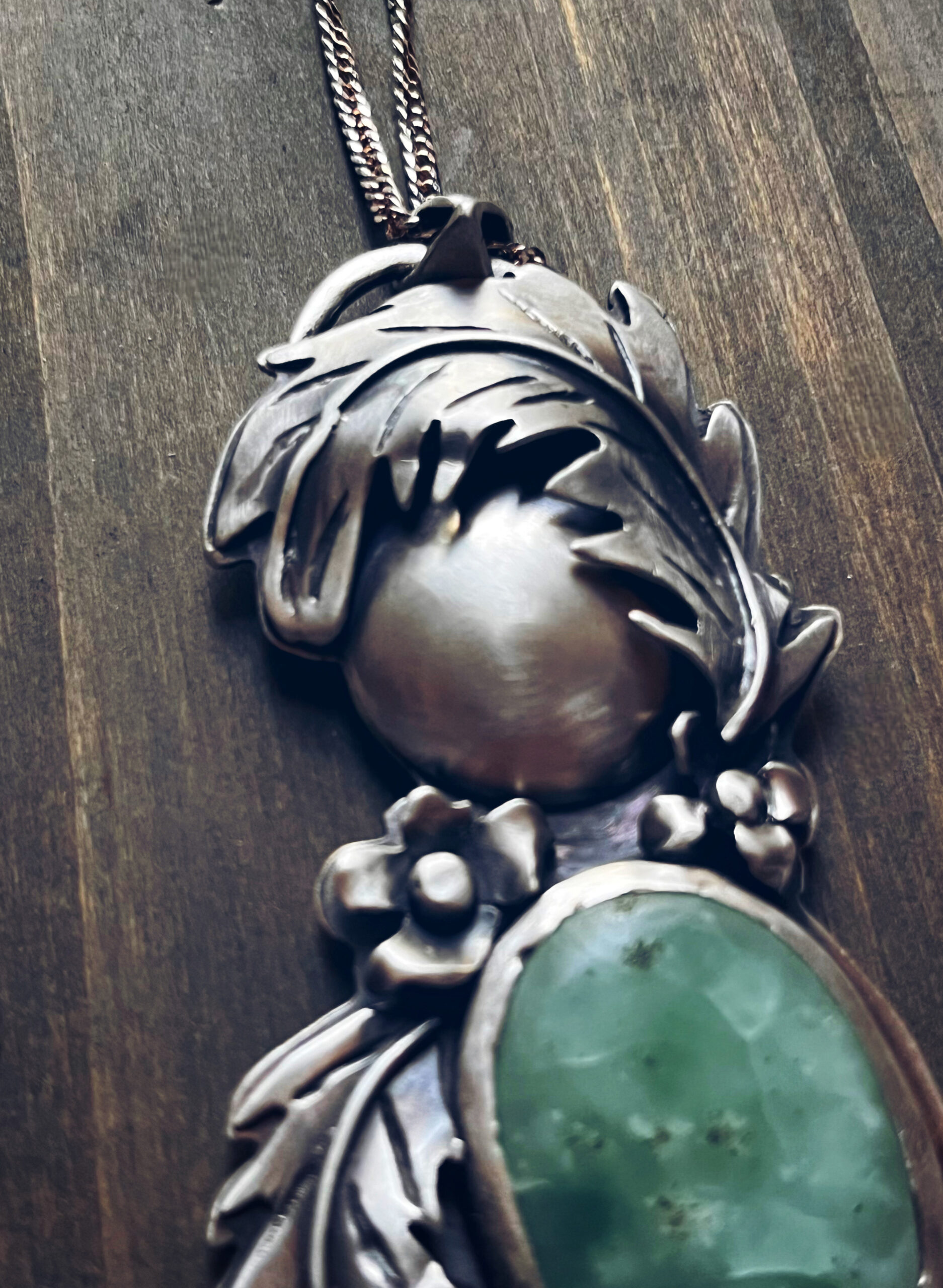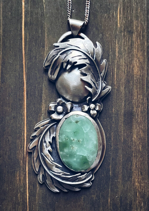 This Mama Earth pendant embodies the nurturing, grounding spirit of femineity and the natural world. At its center sits a soothing smithsonite stone, loved for its soft, calming energy and gentle, earthy color. The stone is cradled in hand-fabricated sterling silver ferns and flowers of the artist original drawings; translated meticulously into beautiful embellishments.
