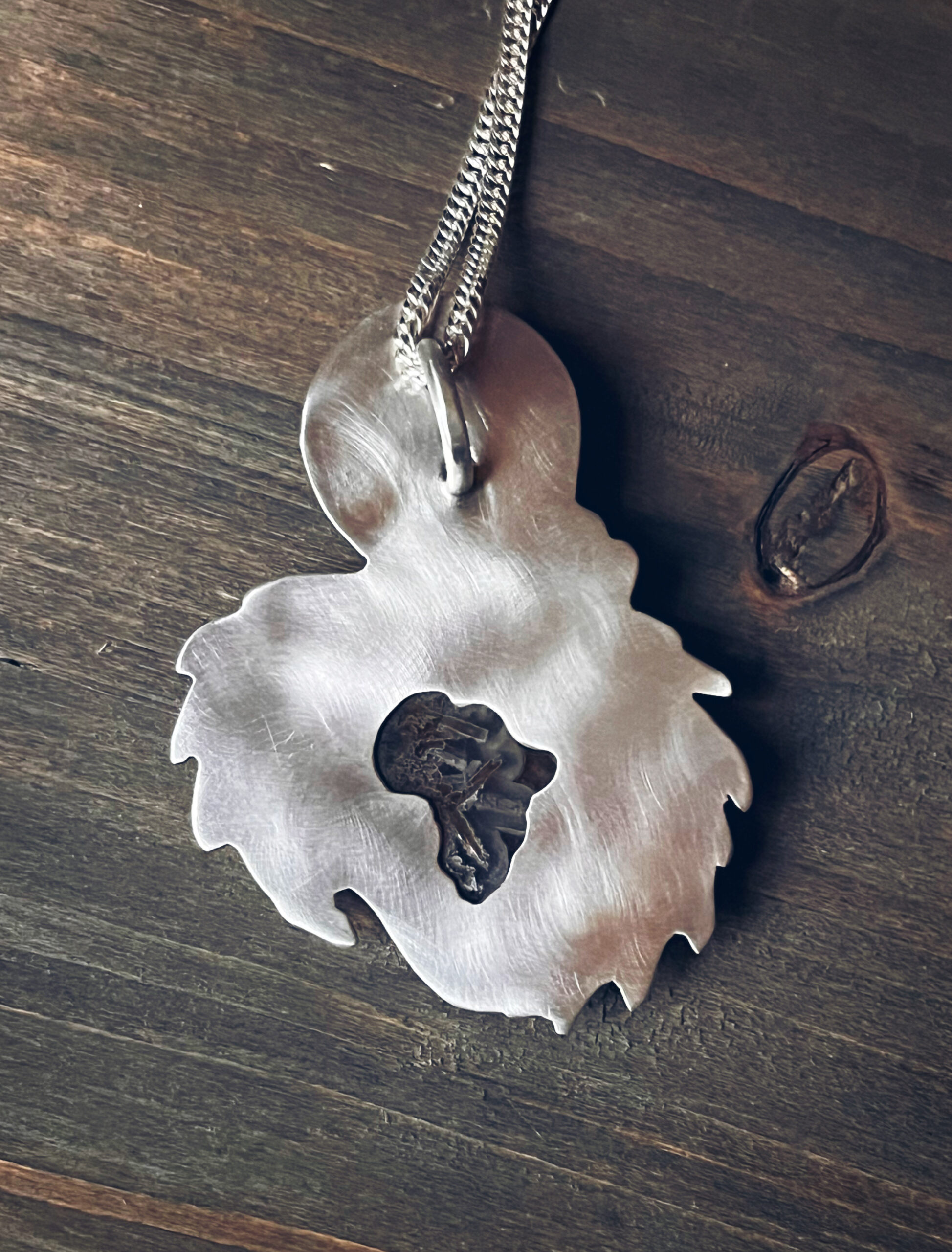 On the back of the pendant, a hand-sawed silhouette of the African continent creates a striking see through window, allowing light to pass through the agate and revealing its natural patterns.