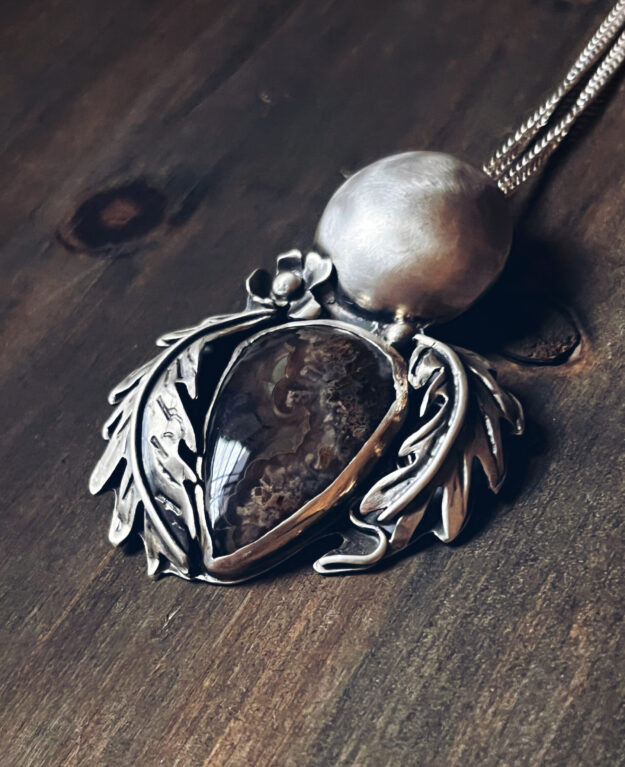 This handcrafted sterling silver pendant from the Mama Earth collection features a rich, earthy agate stone cradled in a sculpted bezel. A single hand-drawn flower and delicately hand-drawn ferns wrap around the stone; each one transformed into sterling silver to honor nature’s quiet beauty and feminine spirit.