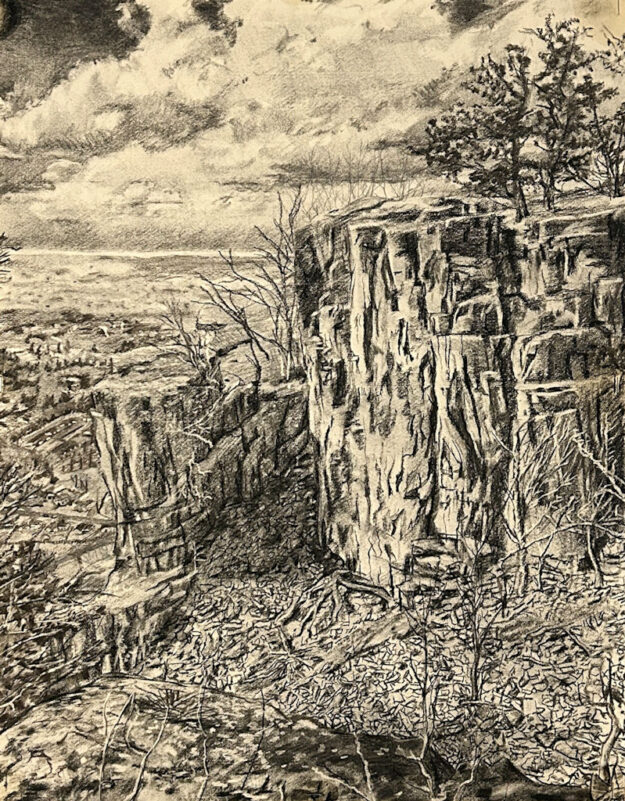 Deeply textural in nature, the detailed line work in this study of Mount Tom speaks to the raw geology and rugged spirit of New England’s landscape. Meticulously hand-rendered in charcoal and graphite, each mark traces the mountain’s layered traprock faces and sweeping cliffs that rise dramatically above the Connecticut River Valley. Dense crosshatching and intentional contrast give form to talus slopes, shifting light, and the commanding presence of the highest peak along the Metacomet Ridge, evoking both permanence and quiet grandeur.