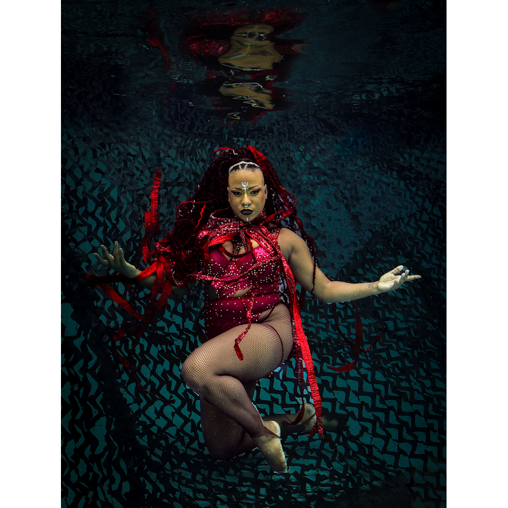 Olokun rises from the depths like a sacred current -tendrils floating like living fire, each one whispering secrets of the sea and sky. In this powerful underwater portrait, this beautiful god gazes directly into your soul—siren, sovereign, and spirit embodied. Olokun is a breathless moment suspended in water and wonder commanding attention. The ocean moves with her, and through her, it remembers the divine feminine in all its strength, sensuality, and mystery. Captured entirely underwater without AI, this work is the creation of MeduSirena—renowned aquatic performer, career mermaid pioneer, and artistic visionary.