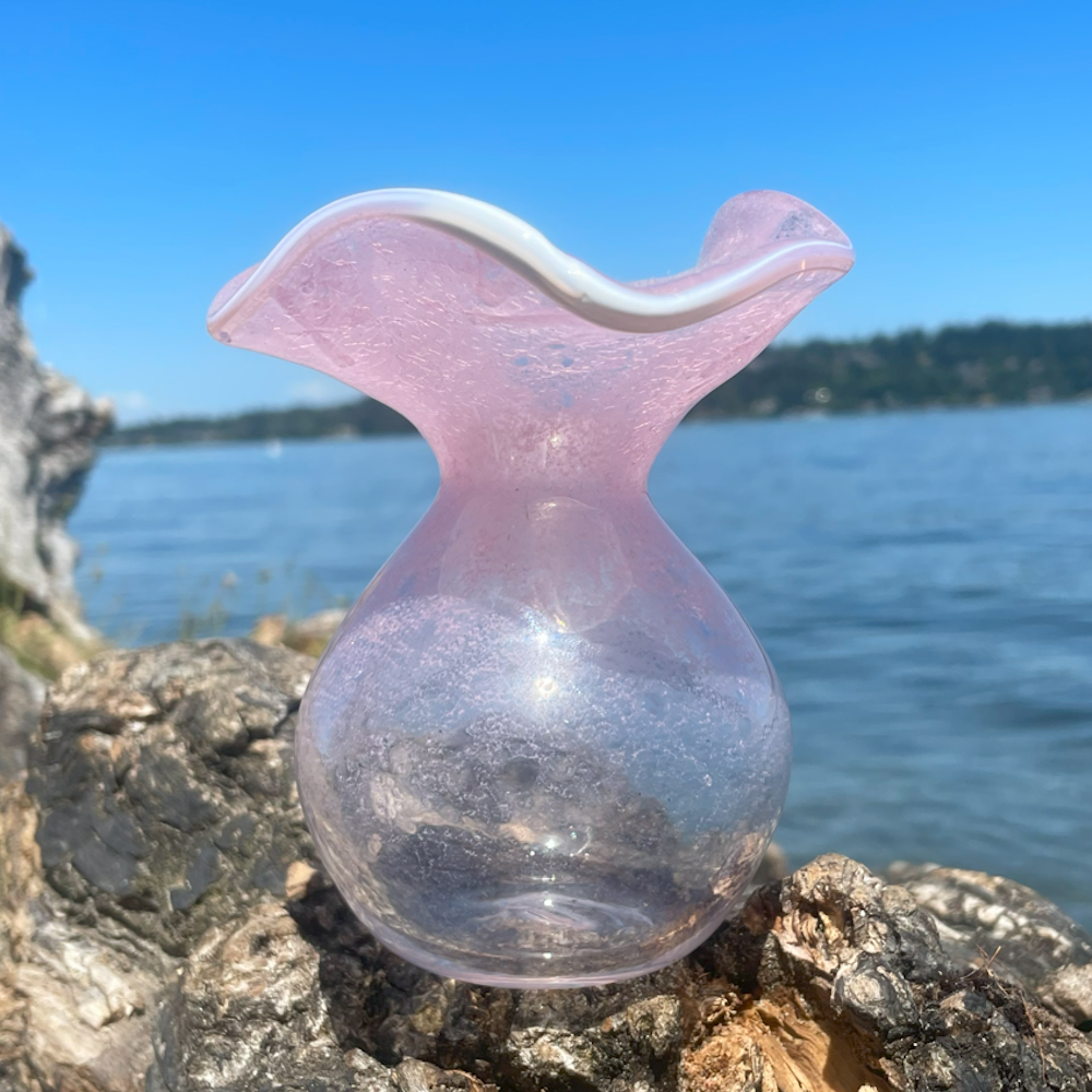Hand-blown by Phillip Moran · Seattle Glass Art. This Chihuly inspired elegant pink bud vase piece, was created using a spin technique that exaggerates the centrifugal force of molten glass—resulting in soft waves and crystal lines as it rapidly cools. The white lip wrap adds contrast and formality offering classic Venetian styling, but interpreted through a Northwest lens. This piece is both sculptural and highly collectible in its subtle beauty.