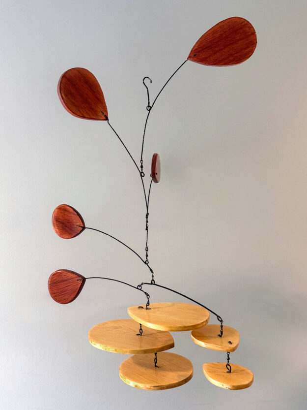 Inspired by mid-century modern design and the rhythms of the natural world—the sway of branches, the rise of tides, the circular path of planets—each piece explores balance, proportion, and harmony through movement. Painted steel wire acts as both structure and line, while hand-finished wood elements bring warmth and grounding presence.