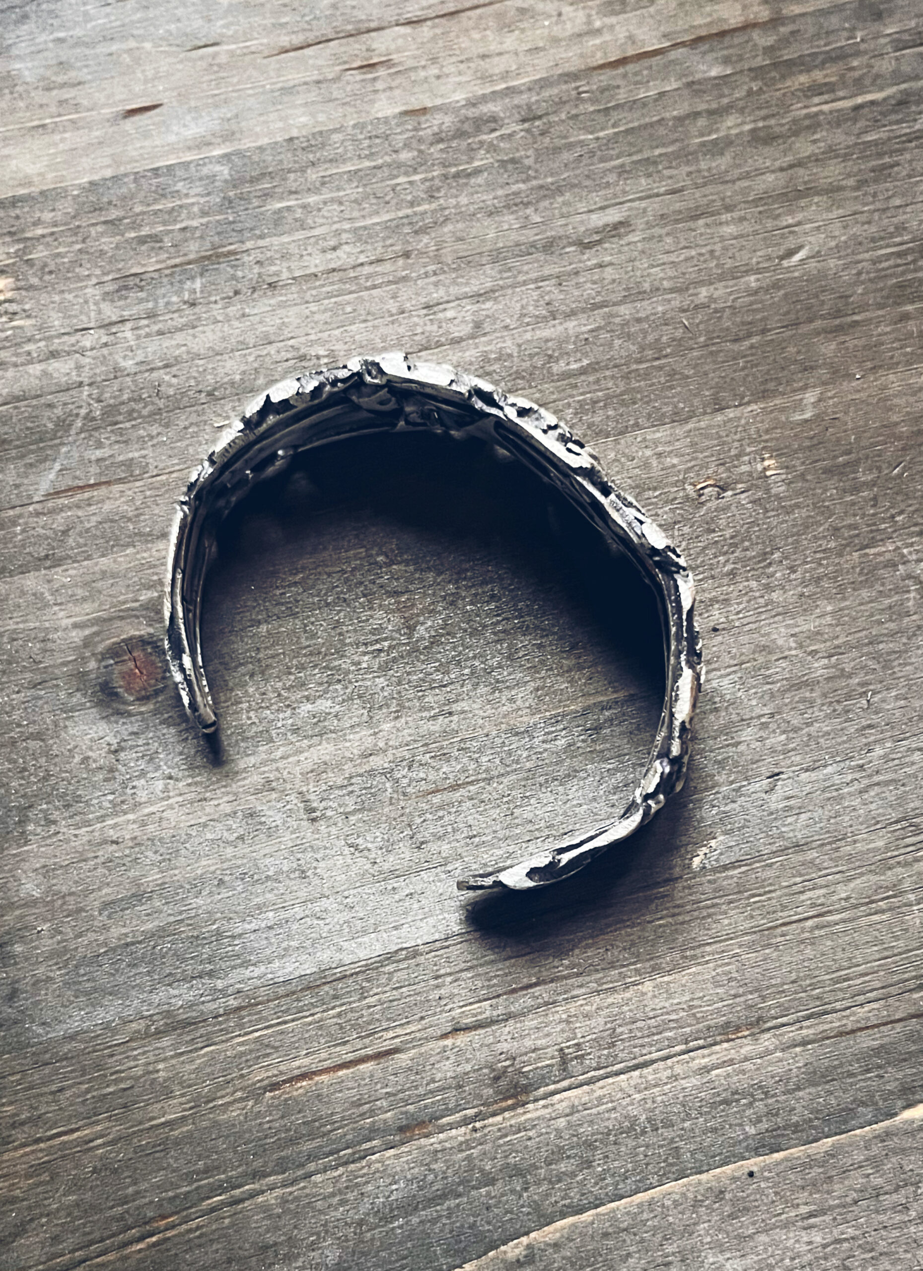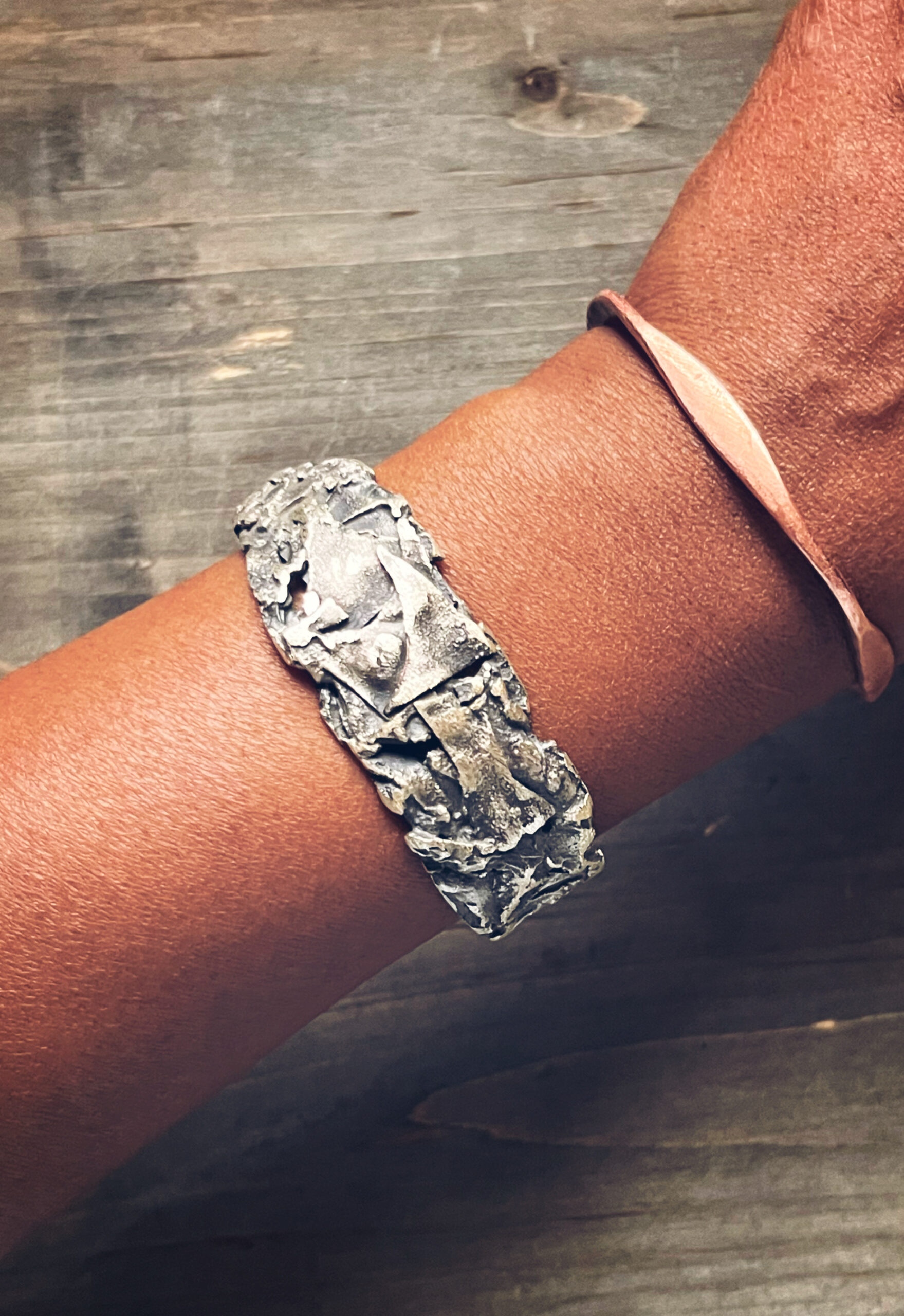 Recycled sterling silver bracelet was crafted from my sterling silver scrap from previous projects, transformed into new life through an organic, sculptural design process known as infusing. Each piece has a naturally fluid, almost abstract form. The silver was darkened with patina to deepen the shadows and add dimension, then carefully highlight the raised surfaces so the textures take center stage.