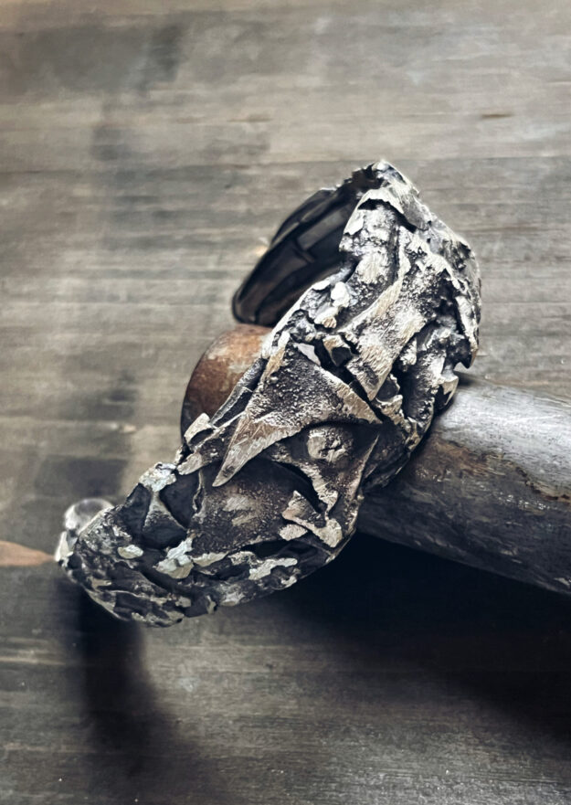 The contrast brings every curve, groove, and detail to life. The result is a one of kind wearable artwork, rich with character and movement.