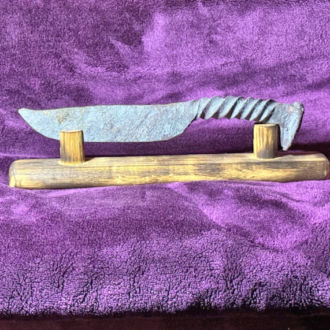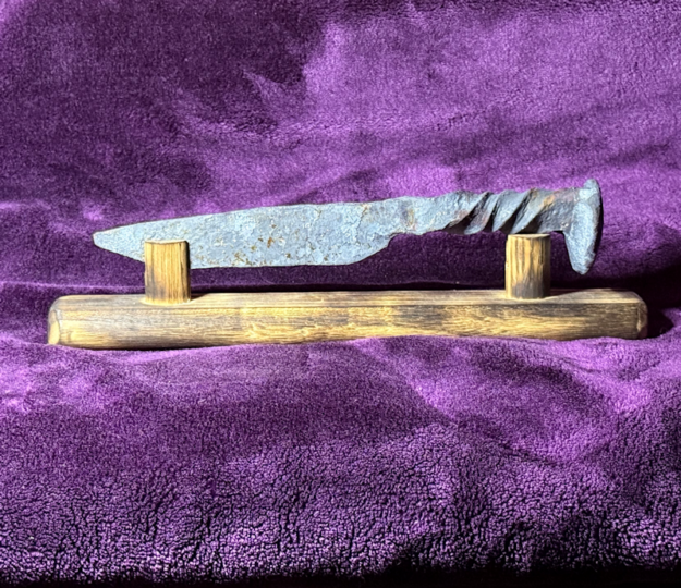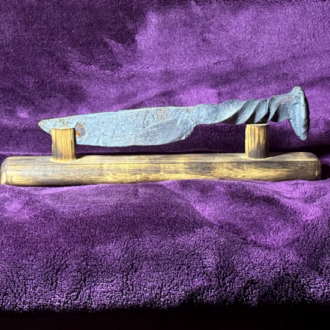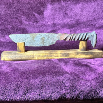 Hand-forged from a reclaimed railroad spike, this tanto knife combines bold geometry with practical strength. Forged entirely by hand using traditional blacksmithing techniques, each blade is fire-forged and finished by the artist in her Seattle forge, making every piece one-of-a-kind with natural variations in form and texture.