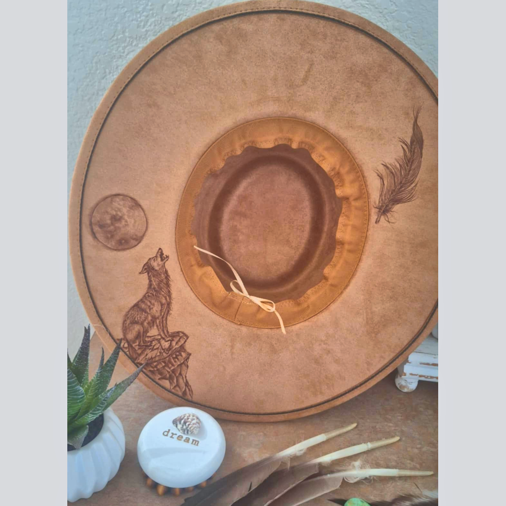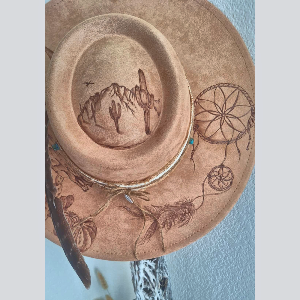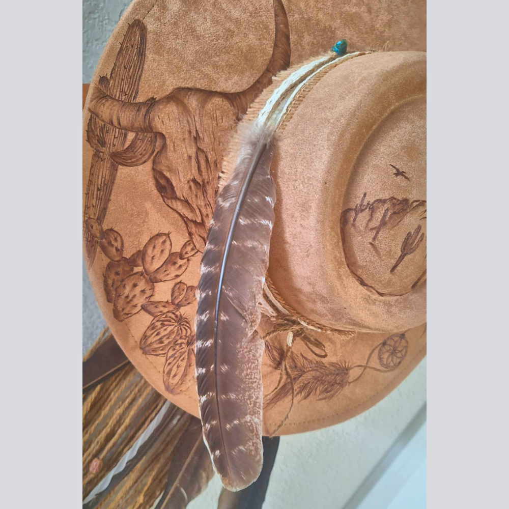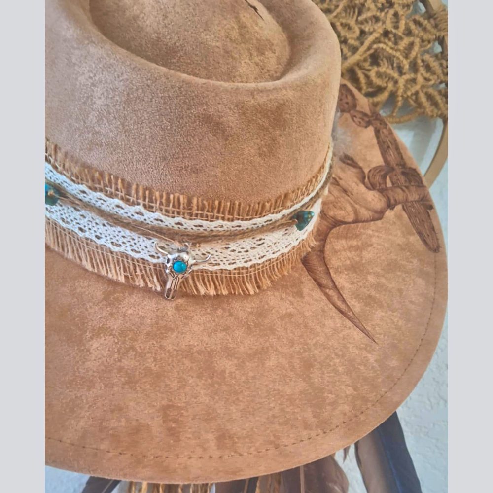 This natural/beige wide-brim fedora- embellished with wide lace hatband featuring turquoise and silver charms and feather, speaks to the soul that craves open skies and untamed places. A hand burned designed inspired by wild landscapes and natural freedom, this hat brings grounded elegance with adventurous spirit. Find designs under the brim too! One size fits most – includes adjustable inner band.