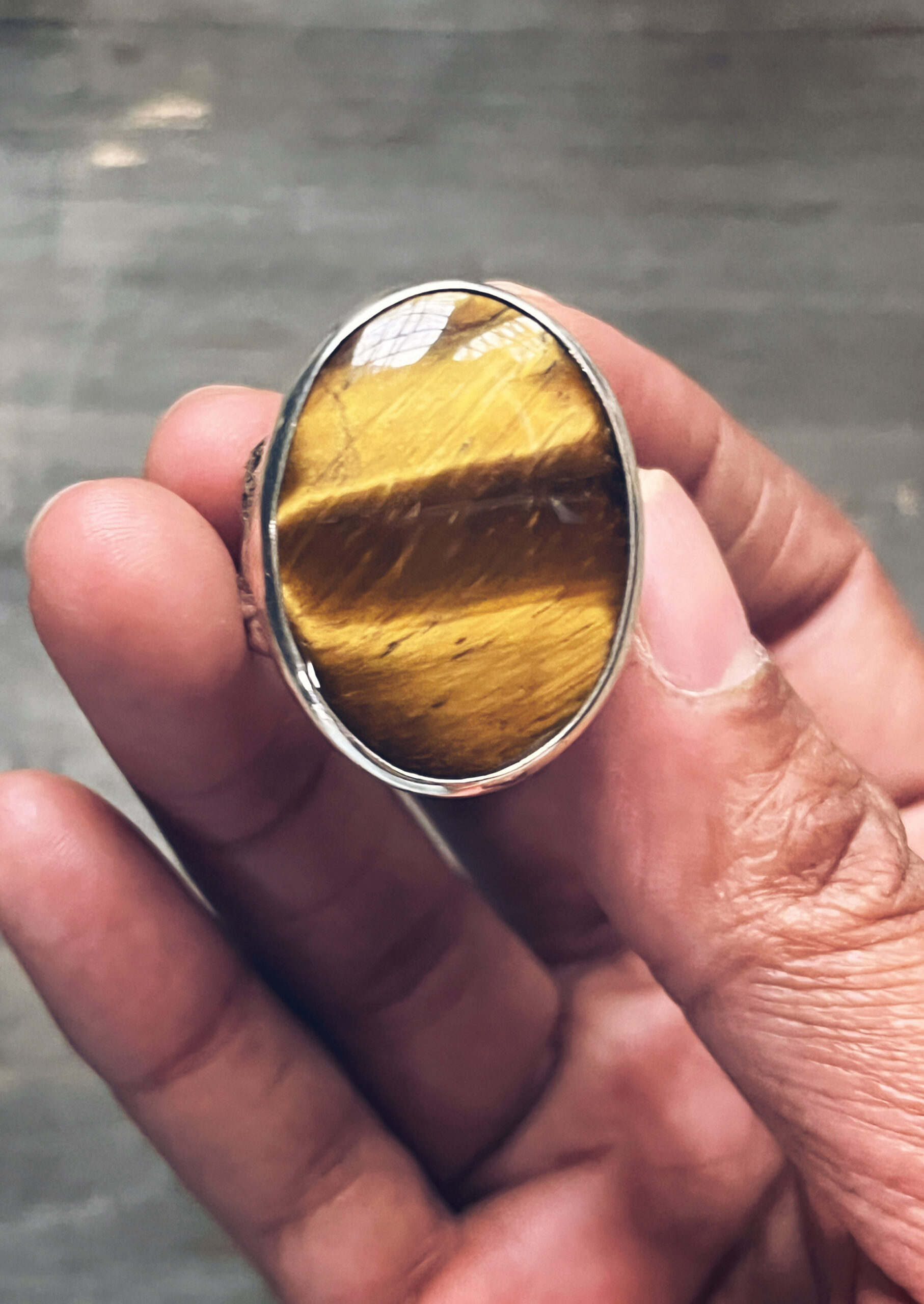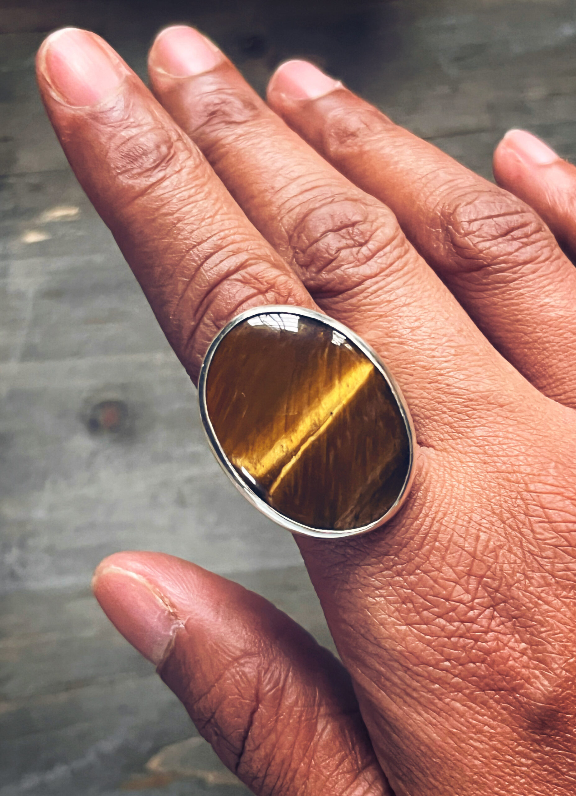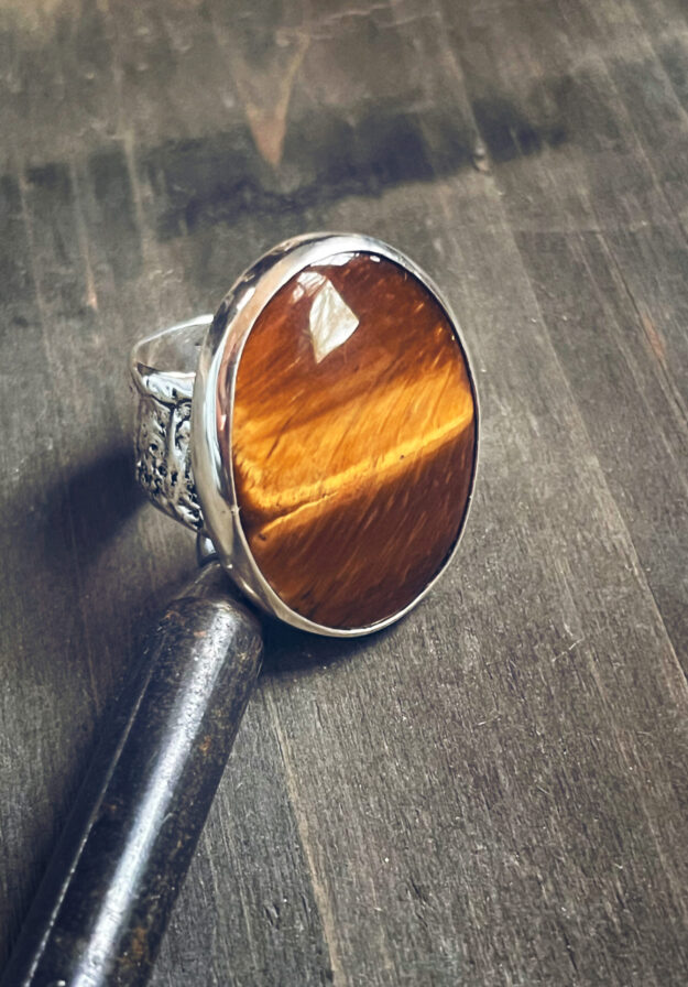 This bold men’s or woman’s ring features a rich, golden-brown tiger’s eye stone set in solid sterling silver. The band is textured with a unique crater-like pattern, created by infused silver dust that gives the surface an organic, lunar feel.