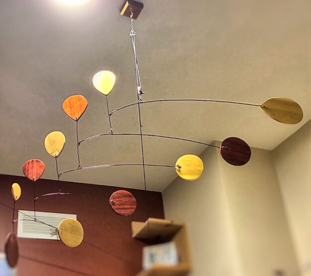 Each hanging mobile is carefully balanced so it can respond naturally to air currents. A subtle shift in temperature, a nearby doorway opening, or the quiet movement of a room is enough to set the forms into slow rotation. The motion is never mechanical or forced. It’s organic, gentle, and continuous.
