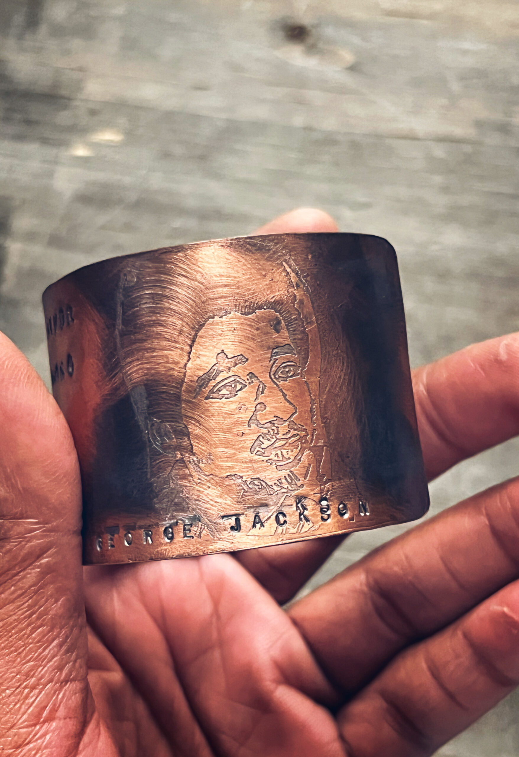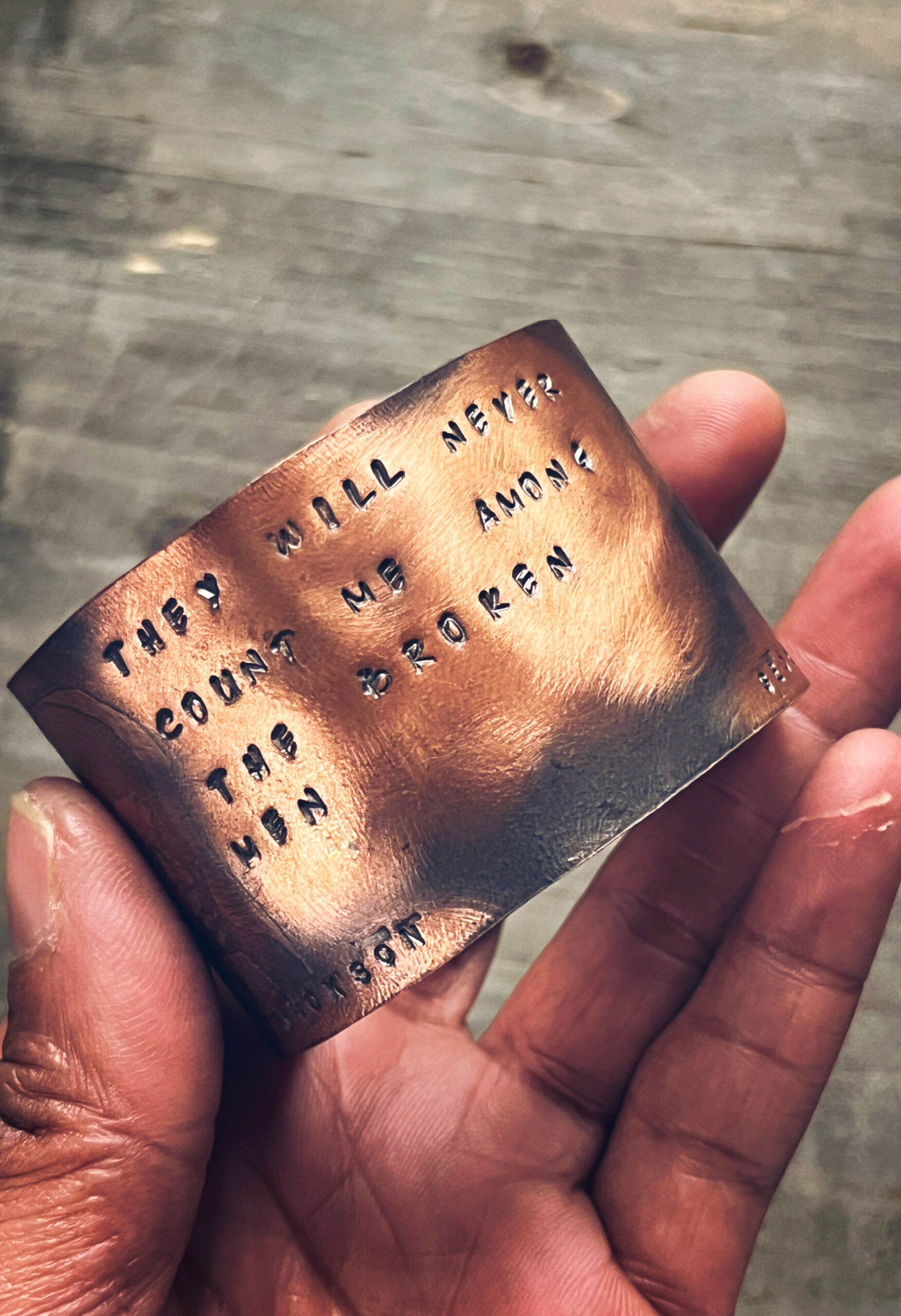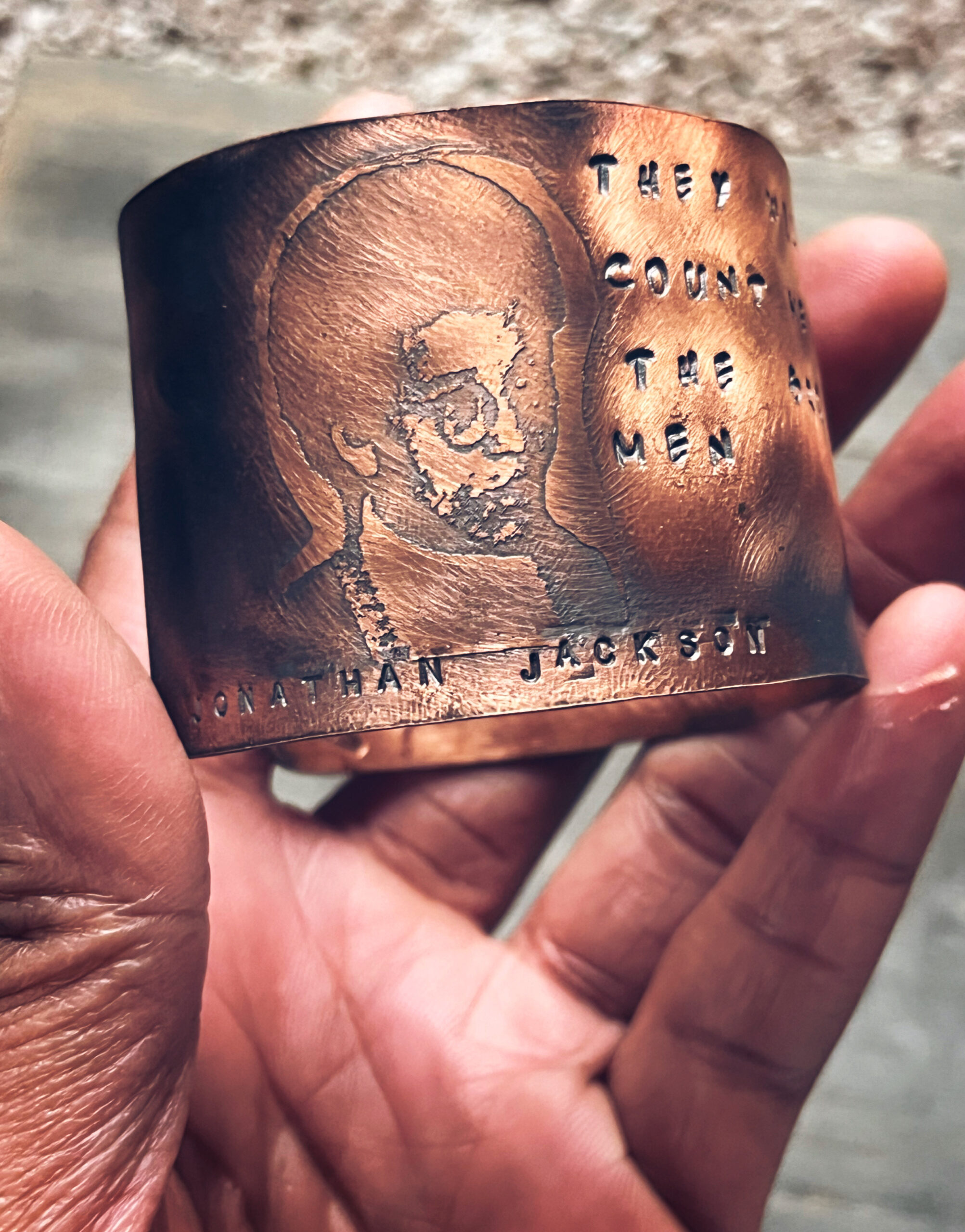 The Warrior Series honors revolutionary African and Black American ancestors who stood fiercely and unapologetically for their people. These pieces pay tribute to uncompromising warrior-elders, leaders, educators, and freedom fighters whose strength, wisdom, and courage shaped history. Each cuff bracelet features hand-etched imagery, permanently engraved into copper, brass, bronze or crafted in sterling silver. Hand stamped is a quate from George Jackson and it reads…. “They will never count me among the broken men”.