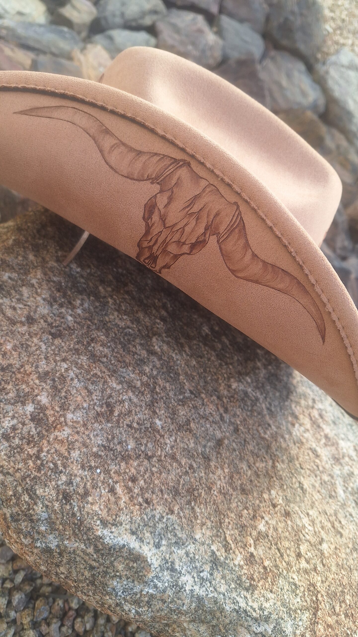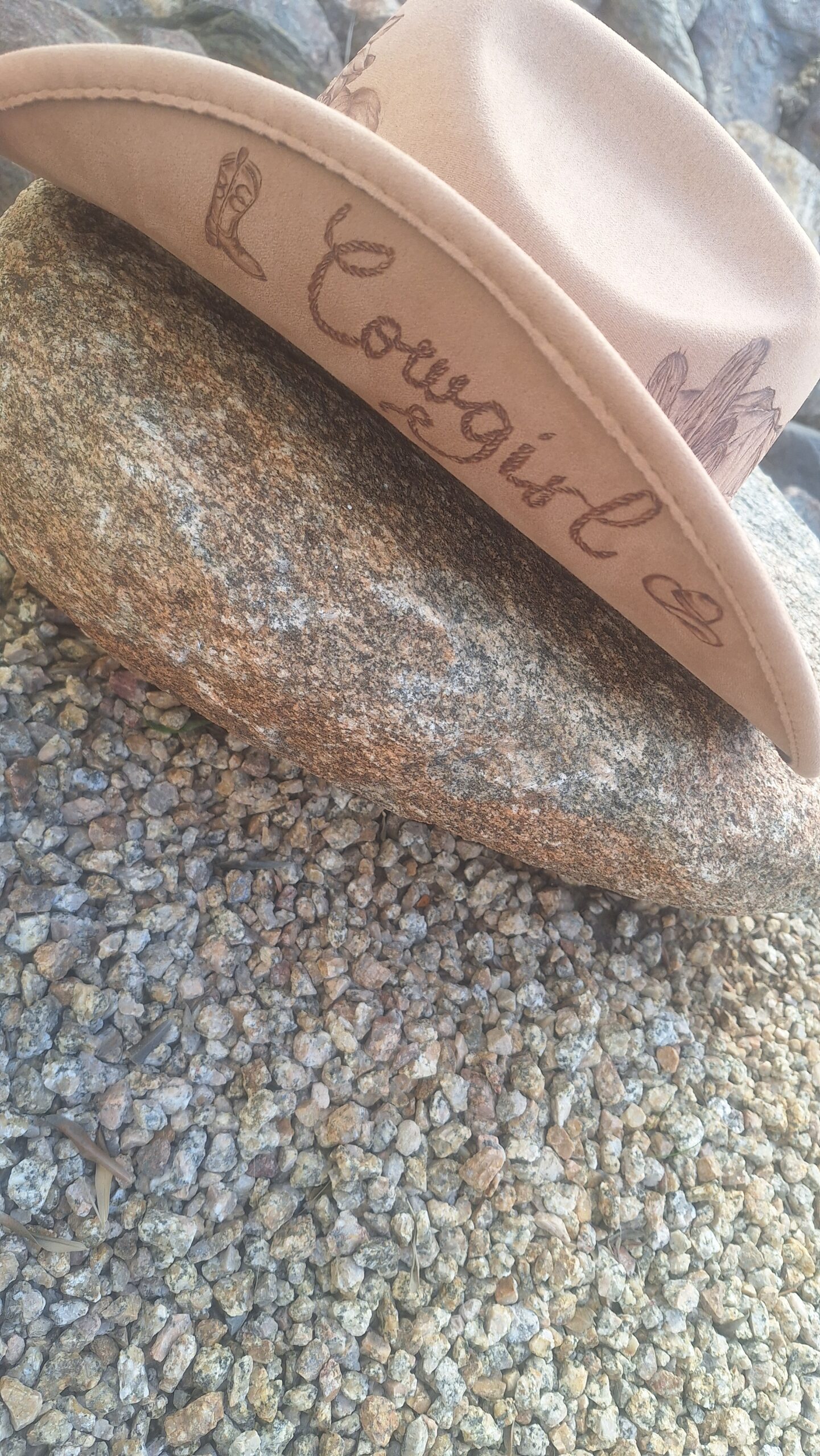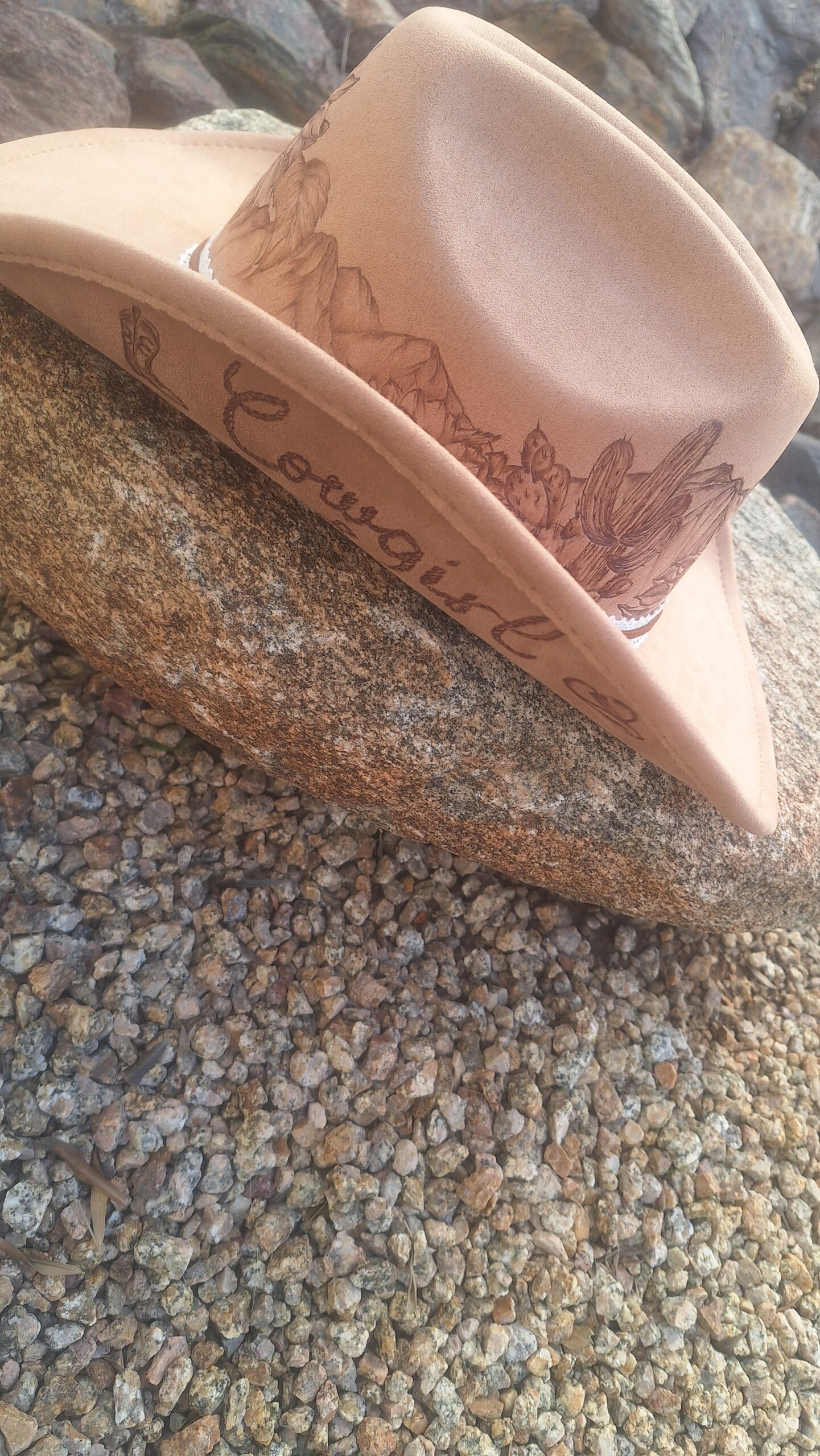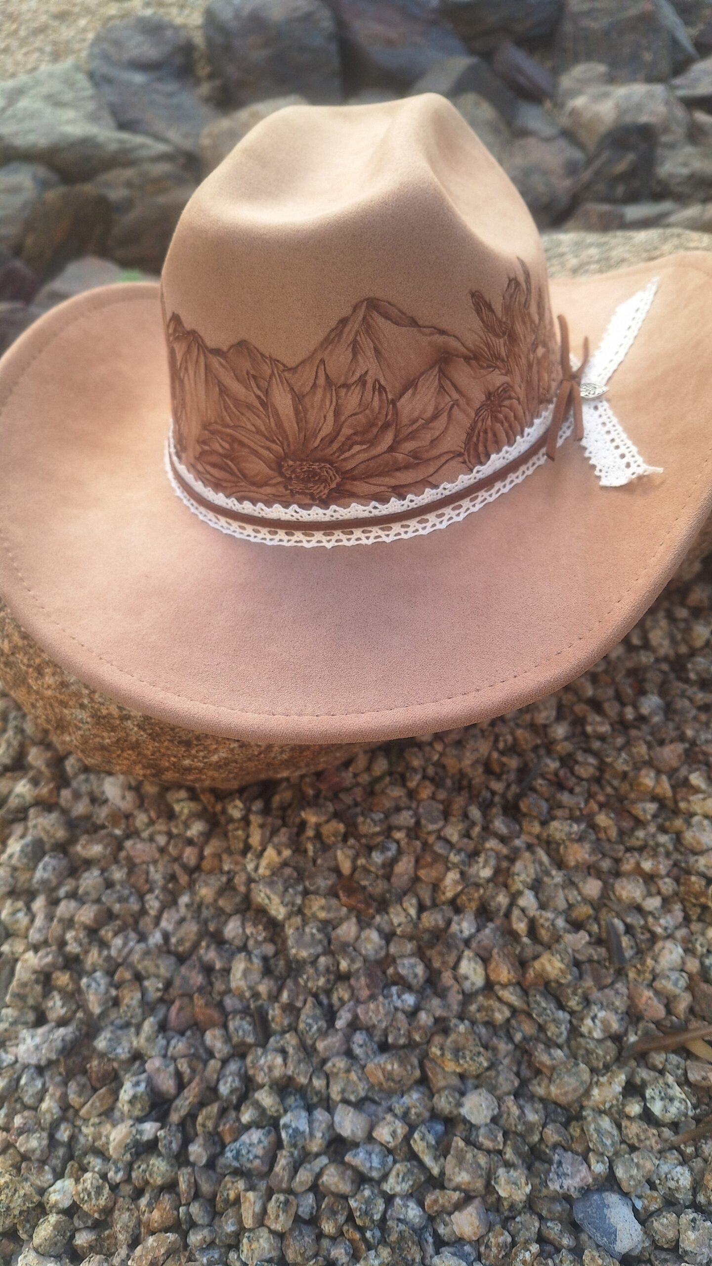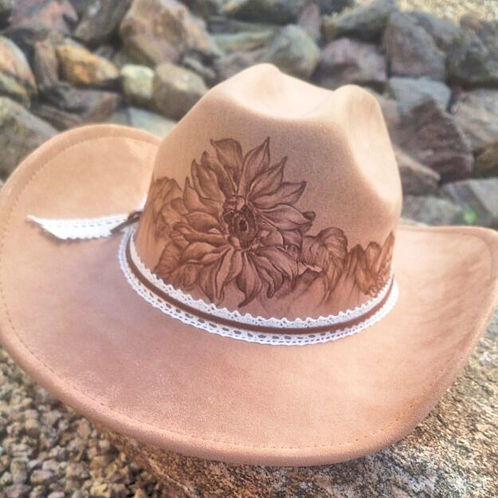 “Sunflowers in the Desert” hand-burned cowboy style hat light beige (neutral) Size is medium. Can tighten for snug fit. Soft and flowy brim Very comfortable and unique! Shipping included!